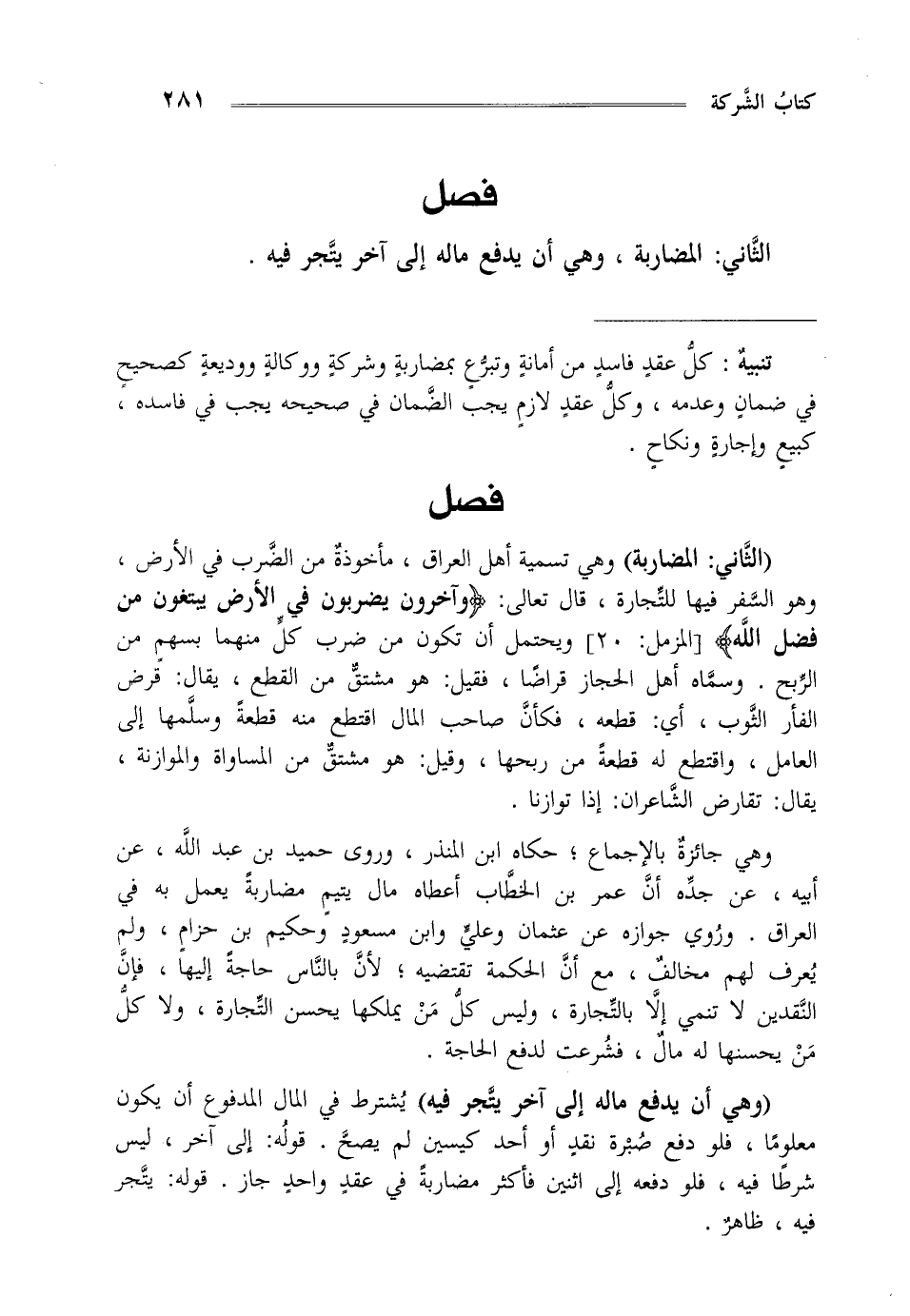 "الثاني: المضاربة" وهي تسمية أهل العراق مأخوذة من الضرب في الأرض وهو السفر فيها للتجارة قال تعالى: {وَآخَرُونَ يَضْرِبُونَ فِي الْأَرْضِ يَبْتَغُونَ مِنْ فَضْلِ اللَّهِ} [المزمل:20] ويحتمل أن تكون من ضرب كل منهما بسهم من الربح وسماه أهل الحجاز قراضا فقيل هو مشتق من القطع يقال قرض الفأر الثوب أي: قطعه فكأن صاحب المال اقتطع منه قطعة وسلمها إلى العامل واقتطع له قطعة من ربحها وقيل: هو مشتق من المساواة والموازنة يقال تقارض الشاعران إذا توازنا