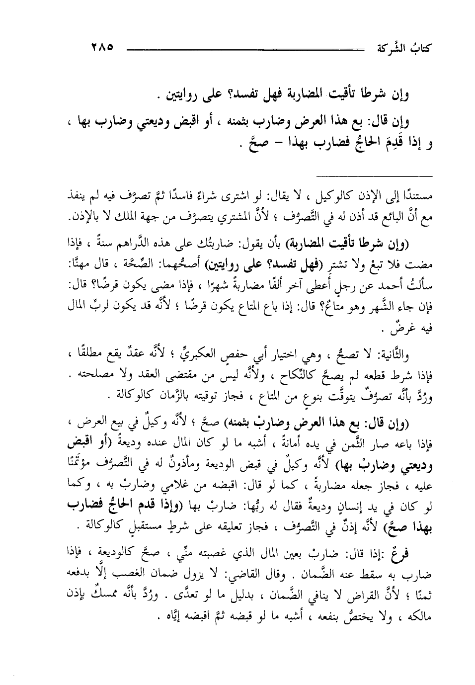 "وإن شرطا تأقيت المضاربة" بأن يقول ضاربتك على هذه الدراهم سنة فإذا مضت فلا تبع ولا تشتر "فهل تفسد" على روايتين" أصحهما: الصحة قال مهنا سألت أحمد عن رجل أعطى آخر ألفا مضاربة شهرا فإذا مضى يكون قرضا قال فإن جاء الشهر وهو متاع قال إذا باع المتاع يكون قرضا لأنه قد يكون لرب المال فيه غرض