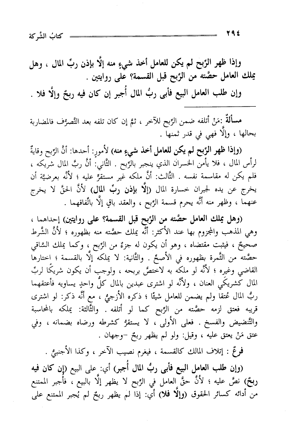 "وإذا ظهر الربح لم يكن للعامل أخذ شيء منه" لأمور أحدها: أن الربح وقاية لرأس المال فلا يأمن الخسران الذي ينجبر بالربح الثاني: أن رب المال شريكه فلم يكن له مقاسمة نفسه الثالث: أن ملكه غير مستقر عليه لأنه بعرضية أن يخرج عن يده لجبران خسارة المال "إلا بإذن رب المال" لأن الحق لا يخرج عنها ظهر منه أنه يحرم قسمةالربح والعقد باق إلا باتفاقهما