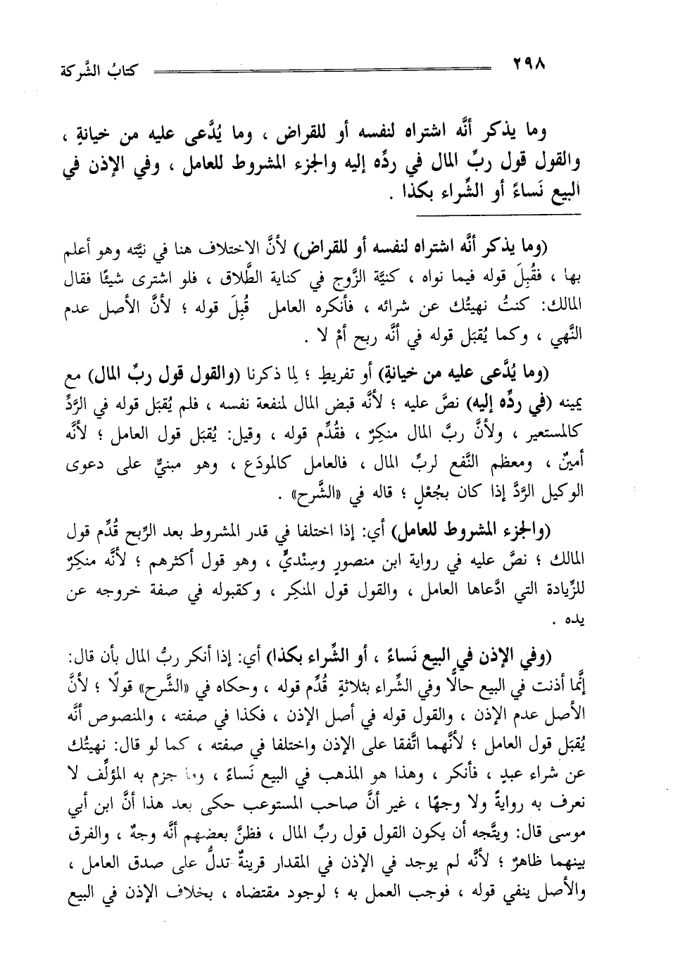 وما يذكر أنه اشتراه لنفسه أو للقراض وما يدعى عليه من خيانة والقول قول رب المال في رده إليه والجزء المشروط للعامل وفي الإذن في البيع نساء أو الشراء بكذا.