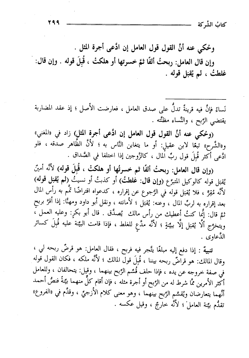 "وإن قال العامل ربحت ألفا ثم خسرتها أو هلكت قبل قوله" لأنه أمين يقبل قوله كالوكيل المتبرع "وإن قال: غلطت" أو كذبت أو نسيت "لم يقبل قوله" لأنه مقر فلا يقبل قوله في الرجوع عن إقراره كدعواه أقتراضا تمم به رأس المال بعد إقراره به لرب المال وعنه: يقبل لأمانته ونقل أبوداود ومهنا إذا أقر بربح ثم قال إنما كنت أعطيك من رأس مالك يصدق قال أبو بكر وعليه العمل ويتخرج أن لا يقبل إلا ببينة لأنه مدع للغلط فإذا قامت البينة عليه قبل كسائر الدعاوي.