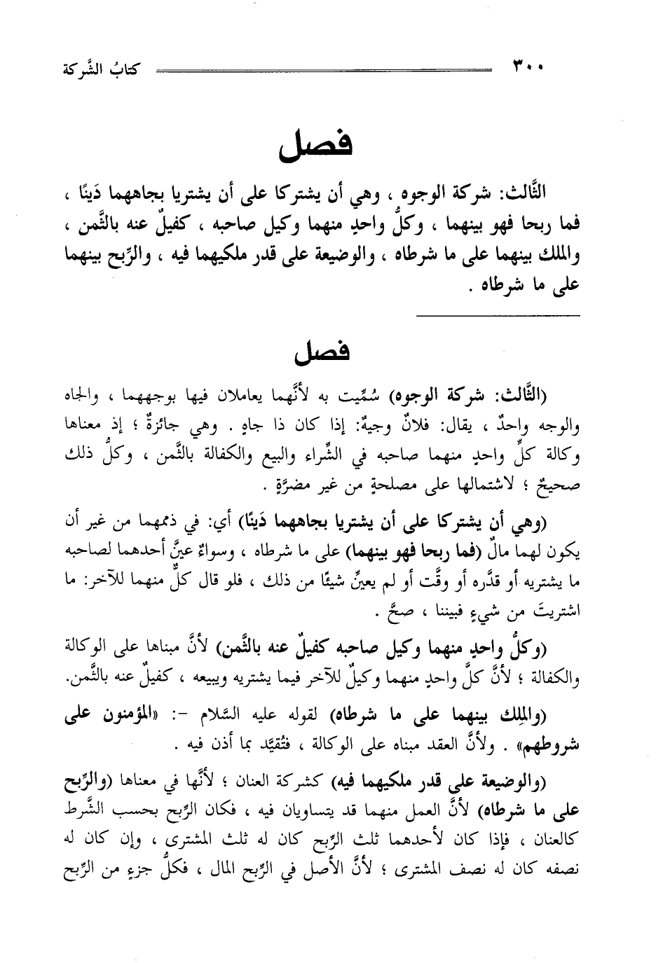 الثالث: شركة الوجوه وهي أن يشتركا على أن يشتريا بجاههما دينا فما ربحا فهو بينهما وكل واحد منهما وكيل صاحبه كفيل عنه بالثمن والملك بينهما على ما شرطا والوضيعة على قدر ملكيهما فيه والربح بينهما على ما شرطاه.