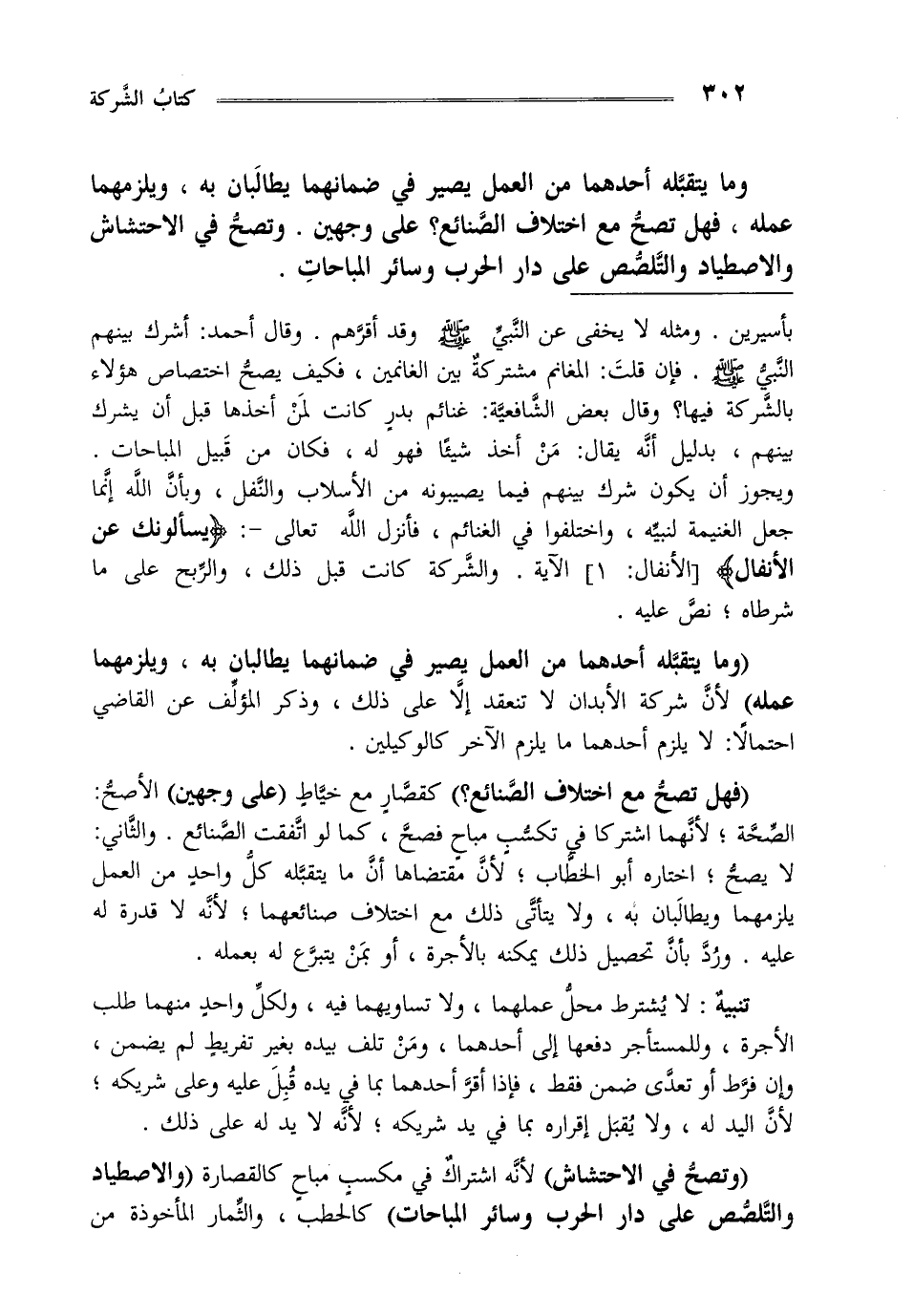 وما يتقبله أحدهما من العمل يصير في ضمانهما يطالبان به ويلزمهما عمله فهل تصح مع اختلاف الصنائع على وجهين وتصح في الاحتشاش والاصطياد والتلصص على دار الحرب وسائر المباحات.