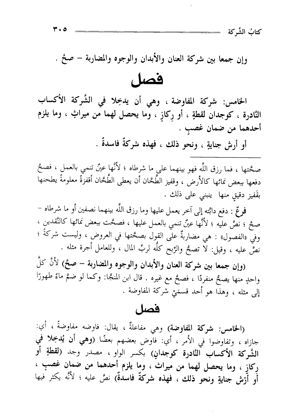 "الخامس: شركة المفاوضة" وهي مفاعلة يقال فاوضه مفاوضة أي: جازاه وتفاوضوا في الأمر أي: فاوض بعضهم بعضا "وهي أن يدخلا في الشركة الأكساب النادرة كوجدان" بكسر الواو مصدر وجد "لقطة أو ركاز وما يحصل لهما من ميراث وما يلزم أحدهما من ضمان غصب أو أرش جناية ونحو ذلك فهذه شركة فاسدة" نص عليه لأنه يكثر فيها