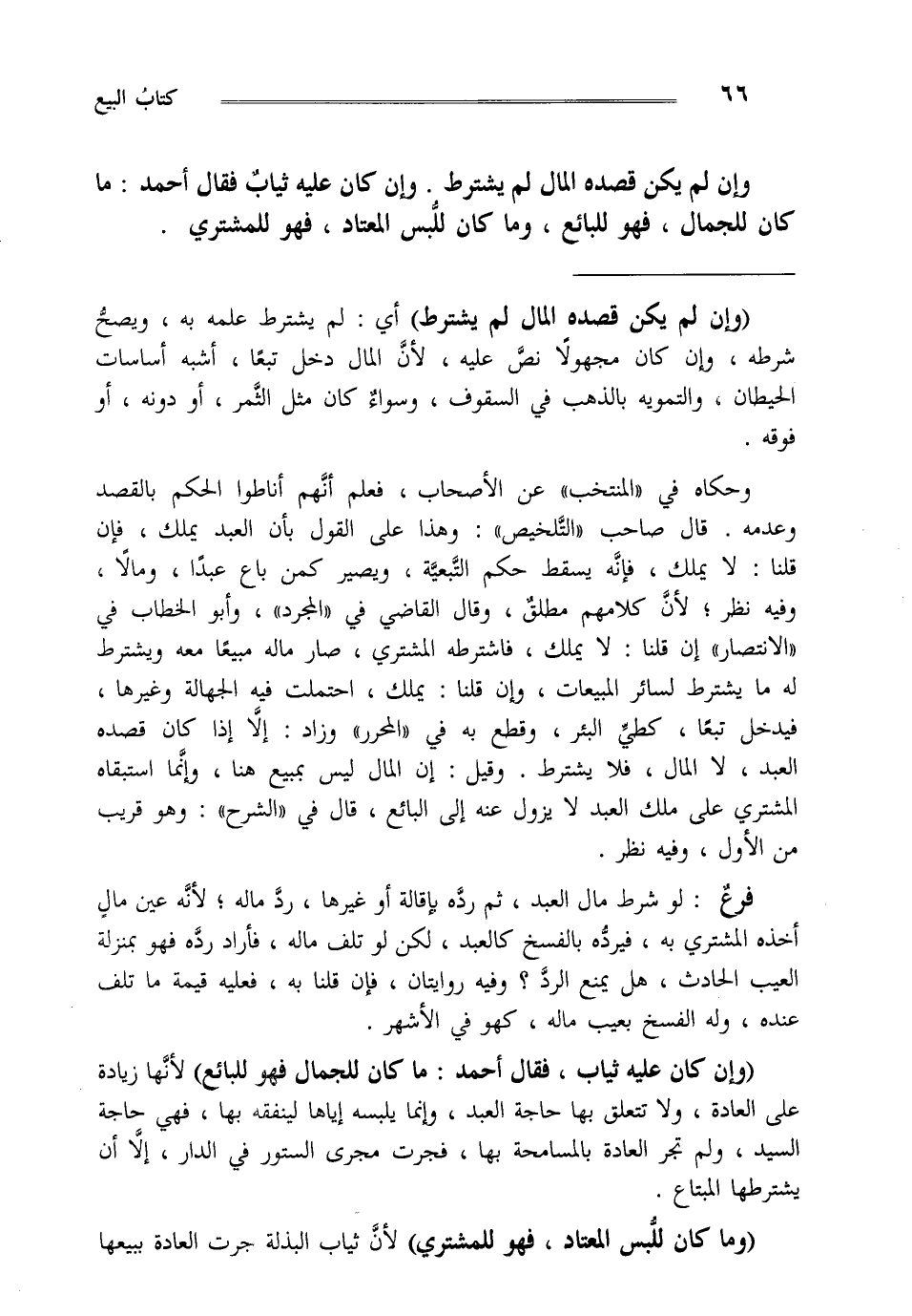 وحكاه في المنتخب عن الأصحاب فعلم أنهم أناطوا الحكم بالقصد وعدمه قال صاحب التلخيص وهذا على القول بأن العبد يملك فإن قلنا: لا يملك فإنه يسقط حكم التبعية الرجعة كمن باع عبدا ومالا وفيه نظر لأن كلامهم مطلق وقال القاضي: في المجرد وأبو الخطاب في الانتصار إن قلنا: لا يملك فاشترطه المشتري صار ماله مبيعا معه ويشترط له ما يشترط لسائر المبيعات وإن قلنا: يملك احتملت فيه الجهالة وغيرها فيدخل تبعا كطي البئر وقطع به في المحرر وزاد إلا إذا كان قصده العبد لا المال فلا يشترط وقيل: إن المال ليس بمبيع هنا وإنما استبقاه المشتري على ملك العبد لا يزول عنه إلى البائع قال في الشرح وهو قريب من الأول وفيه نظر فرع: لو شرط مال العبد ثم رده بإقالة أو غيرها رد ماله لأنه عين مال أخذه المشتري به فيرده بالفسخ كالعبد لكن لو تلف ماله فأراد رده فهو بمنزلة العيب الحادث هل يمنع الرد وفيه روايتان فإن قلنا: به فعليه قيمة ما تلف عنده وله الفسخ بعيب ماله كهو في الأشهر