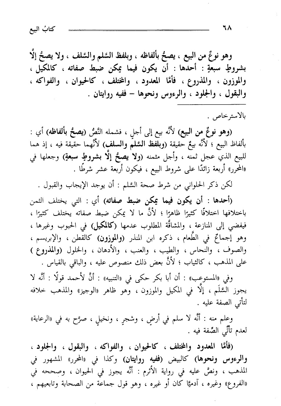 وهو نوع من البيع يصح بألفاظه وبلفظ السلم والسلف ولا يصح إلا بشروط سبعة أحدها: أن يكون فيما يمكن ضبط صفاته كالمكيل والموزون والمذروع فأما المعدود والمختلف كالحيوان والفواكه والبقول والجلود والرؤوس ونحوها ففيه روايتان