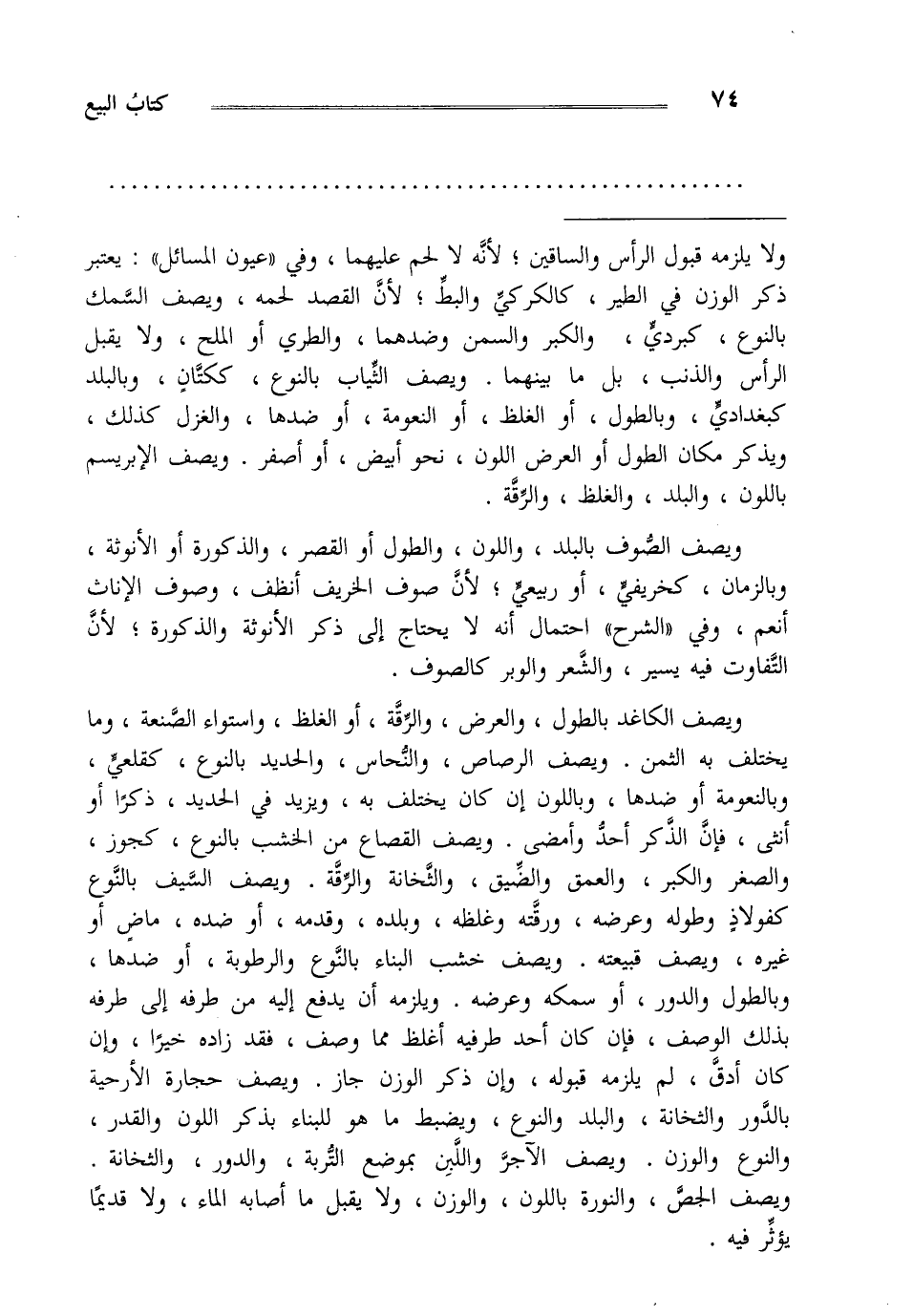 ولا يلزمه قبول الرأس والساقين لأنه لا لحم عليهما وفي عيون المسائل يعتبر ذكر الوزن في الطير كالكركي والبط لأن القصد لحمه ويصف السمك بالنوع كبردي والكبر والسمن وضدهما والطري أو الملح ولا يقبل الرأس والذنب بل ما بينهما ويصف الثياب بالنوع ككتان وبالبلد كبغدادي وبالطول أو الغلظ أو النعومة أو ضدها والغزل كذلك ويذكر مكان الطول أو العرض اللون نحو أبيض أو أصفر ويصف الإ بريسم باللون والبلد والغلظ والرقة