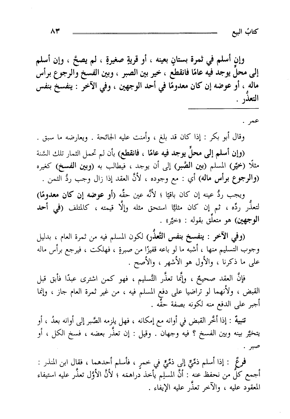 "وإن أسلم إلى محل يوجد فيه عاما فانقطع" بأن لم تحمل الثمار تلك السنة مثلا "خير" المسلم "بين الصبر" إلى أن يوجد فيطالب به "وبين الفسخ" كغيره "والرجوع برأس ماله" أي: مع وجوده لأن العقد إذا زال وجب رد الثمن