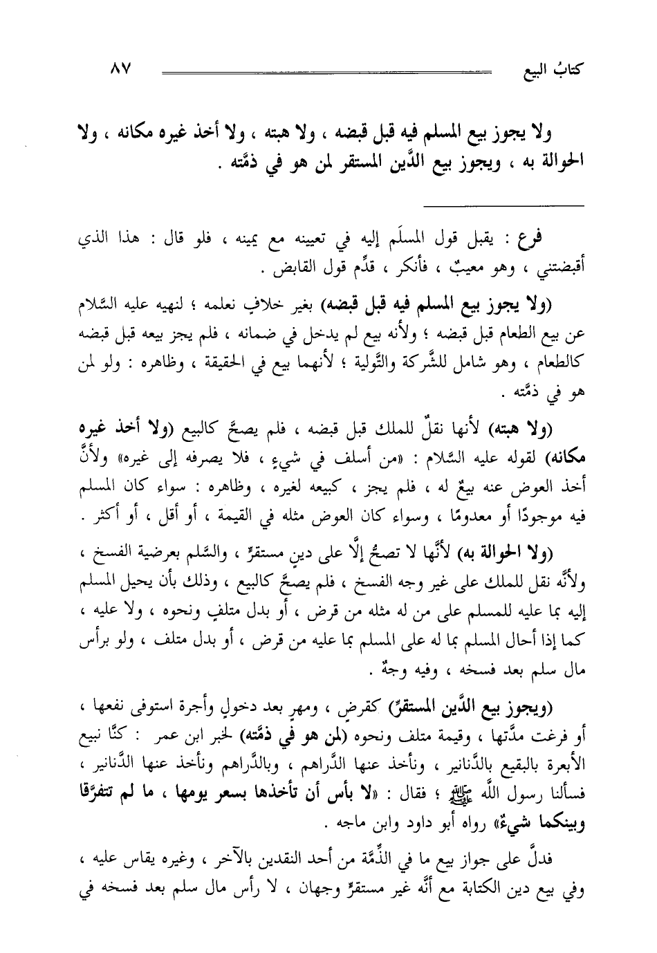 ولا يجوز بيع المسلم فيه قبل قبضه ولا هبته ولا أخذ غيره مكانه ولاالحوالة به ويجوز بيع الدين المستقر لمن هو في ذمته.