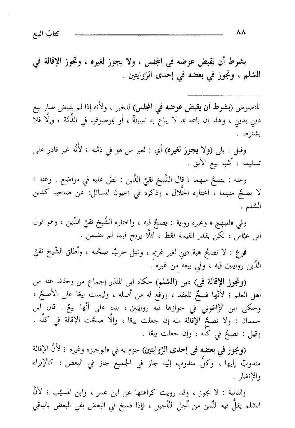 بشرط أن يقبض عوضه في المجلس ولا يجوز لغيره وتجوز الإقالة في السلم، وتجوز في بعضه في إحدى الروايتين