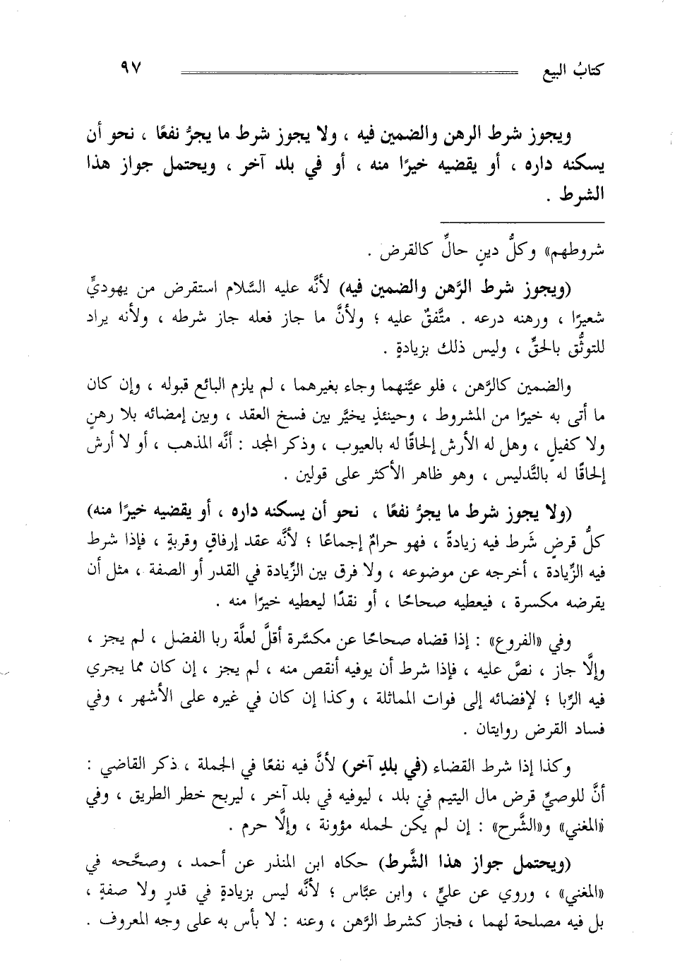 ويجوز شرط الرهن والضمين فيه ولا يجوز شرط ما يجر نفعا نحو أن يسكنه داره أو يقضيه خيرا منه أو في بلد آخر ويحتمل جواز هذا الشرط.