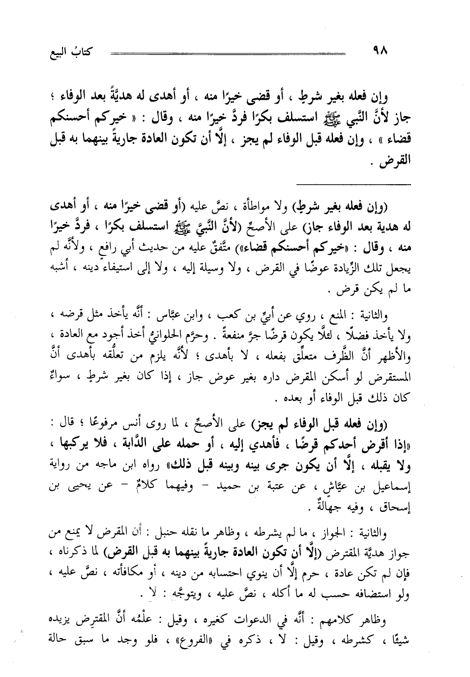 والثانية: المنع روي عن أبي بن كعب وابن عباس أنه يأخذ مثل قرضه ولا يأخذ فضلا لئلا يكون قرضا جر منفعة وحرم الحلواني أخذ أجود مع العادة والأظهر أن الظرف متعلق بفعله لا بأهدى لأنه يلزم من تعلقه بأهدى أن المستقرض لو أسكن المقرض داره بغير عوض جاز إذا كان بغير شرط سواء كان ذلك قبل الوفاء أو بعده