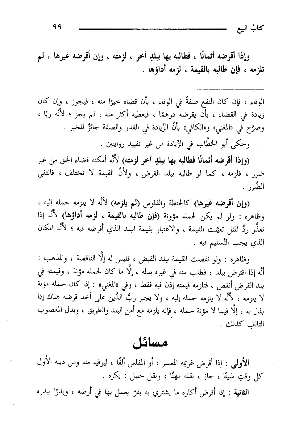 "وإن أقرضه غيرها" كالحنطة والفلوس "لم يلزمه" لأنه لا يلزمه حمله إليه وظاهره: ولو لم يكن لحمله مؤونة "فإن طالبه بالقيمة لزمه أداؤها" لأنه إذا تعذر رد المثل تعينت القيمة والاعتبار بقيمة البلد الذي أقرضه فيه لأنه المكان الذي يجب التسليم فيه