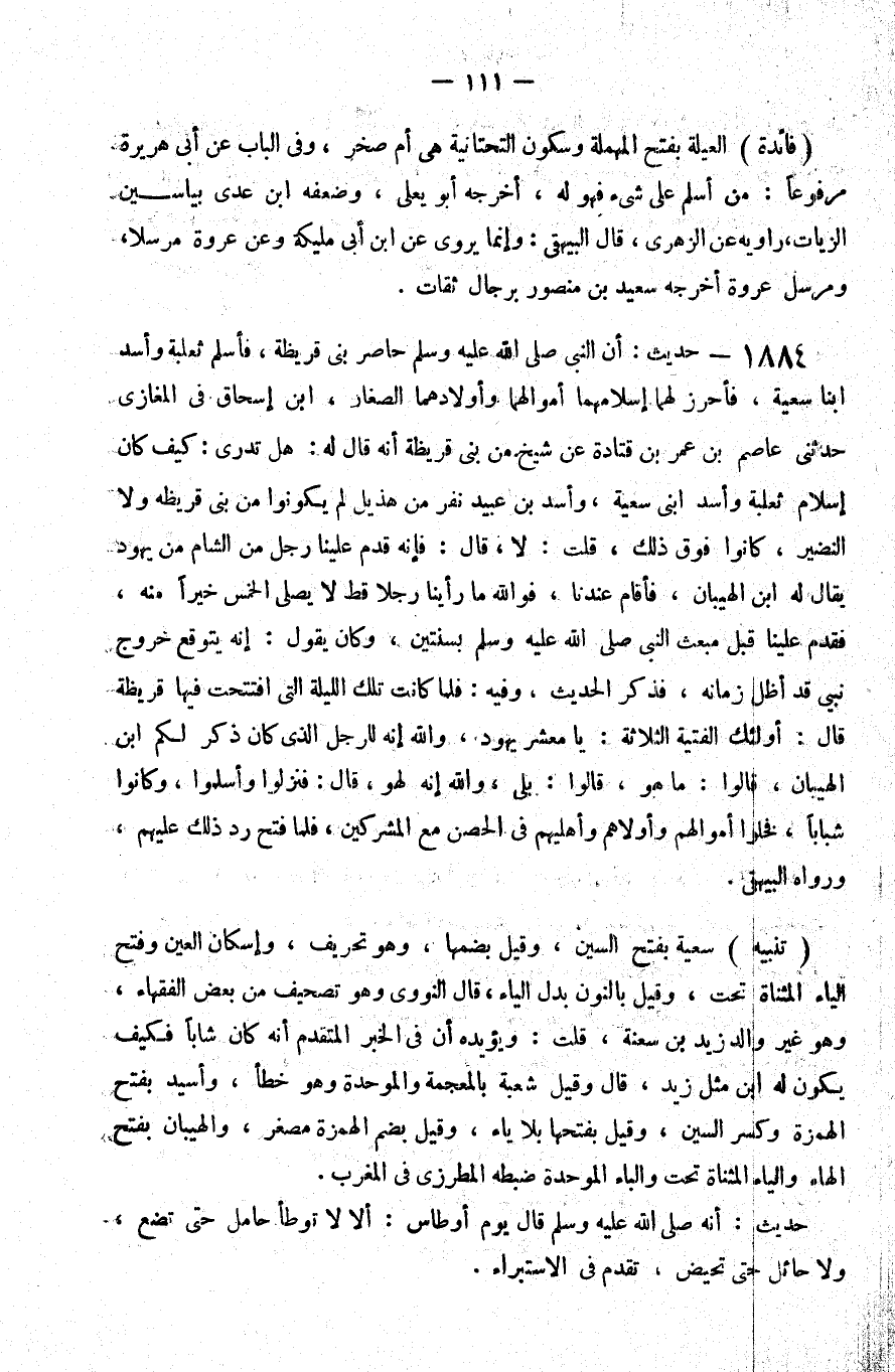1884 - حديث ان النبي صلى الله عليه و سلم حاصر بني قريظة فأسلم ثعلبة وأسد ابنا سعية فأحرز لهما إسلامهما أموالهما وأولادهما الصغار بن إسحاق في المغازي حدثني عاصم بن عمر بن قتادة عن شيخ من بني قريظة أنه قال له هل تدري كيف كان إسلام ثعلبة وأسد ابني سعية وأسد بن عبيد نفر من هذيل لم يكونوا من بني قريظة ولا النضير كانوا فوق ذلك قلت لا قال فإنه قدم علينا رجل من الشام من يهود يقال له بن الهيبان فأقام عندنا فوالله ما رأينا رجلا قط لا يصلي الخمس خيرا منه فقدم علينا قبل مبعث النبي صلى الله عليه و سلم بسنتين وكان يقول إنه يتوقع خروج نبي قد أظل زمانه فذكر الحديث وفيه فلما كانت تلك الليلة التي افتتحت فيها قريظة قال أولئك الفتية الثلاثة يا معشر يهود والله إنه للرجل الذي كان ذكر لكم بن الهيبان قالوا ما هو قالوا بلى والله إنه لهو قال فنزلوا وأسلموا وكانوا شبابا فحلوا أموالهم وأولاهم وأهليهم في الحصن مع المشركين فلما فتح رد ذلك عليهم ورواه البيهقي تنبيه سعية بفتح السين وقيل بضمها وهو تحريف وإسكان العين وفتح الياء المثناة تحت وقيل بالنون بدل الياء قال النووي وهو تصحيف من بعض الفقهاء وهو غير والد زيد بن سعنة قلت ويؤيده أن في الخبر المتقدم أنه ان شابا فكيف يكون له بن مثل زيد قال وقيل شعبة بالمعجمة والموحدة وهو خطأ وأسيد بفتح الهمزة وكسر السين وقيل بفتحها بلا ياء وقيل بضم الهمزة مصغر والهيبان بفتح الهاء والياء المثناة تحت والباء الموحدة ضبطه المطرزي في المغرب