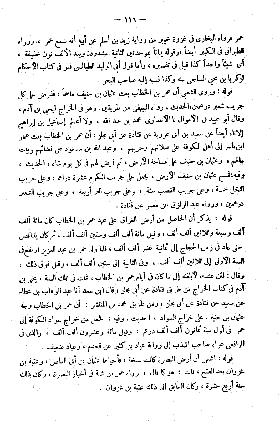 قوله يذكر أن الحاصل من أرض العراق على عهد عمر بن الخطاب كان مائة ألف ألف وسبعة وثلاثين ألف ألف وقيل مائة الف ألف وستين ألف ألف ثم كان يتناقص حتى عاد في زمن الحجاج إلى ثمانية عشر ألف ألف فلما ولي عمر بن عبد العزيز ارتفع في السنة الأولى إلى ثلاثين ألف ألف وفي الثانية إلى ستين ألف ألف وقيل فوق ذلك وقال لئن عشت لأبلغنه إلى ما كان في أيام عمر بن الخطاب فمات في تلك السنة يحيى بن آدم في كتاب الخراج من طريق قتادة عن أبي مجلز وقال بن سعد أنا عبد الوهاب بن عطاء عن سعيد عن قتادة عن أبي مجلز ومن طريق محمد بن المنتشر أن عمر بن الخطاب وجه عثمان بن حنيف على خراج السواد الحديث وفيه فحمل من خراج سواد الكوفة إلى عمر في أول سنة ثمانون ألف ألف درهم وقيل مائة وعشرون ألف ألف والذي في الرافعي عزاه صاحب المهذب إلى رواية عباد بن كثير عن قحدم وعباد ضعيف