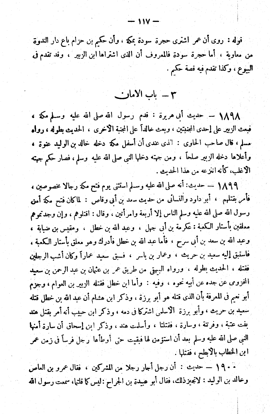 1899 - حديث أنه صلى الله عليه و سلم استثنى يوم فتح مكة رجالا مخصوصين فأمر بقتلهم أبو داود والنسائي من حديث سعد بن أبي وقاص لما كان فتح مكة أمن رسول الله صلى الله عليه و سلم الناس إلا أربعة وامرأتين وقال اقتلوهم وإن وجدتموهم معلقين بأستار الكعبة عكرمة بن أبي جهل وعبد الله بن خطل ومقيس بن ضبابة وعبد الله بن سعد بن أبي سرح فأما عبد الله بن خطل فأدرك وهو معلق بأستار الكعبة فاستبق إليه سعيد بن حريث وعمار بن ياسر فسبق سعيد عمارا وكان أشب الرجلين فقتله الحديث بطوله ورواه البيهقي من طريق عمر بن عثمان بن عبد الرحمن بن سعيد المخزومي عن جده عن أبيه نحوه وفيه وأما بن خطل فقتله الزبير بن العوام وجزم أبو نعيم في المعرفة بأن الذي قتله هو أبو برزة وذكر بن هشام أن عبد الله بن خطل قتله سعيد بن حريث وأبو برزة الأسلمي اشتركا في دمه وذكر بن حبيب أنه أمر بقتل هند بنت عتبة وفرتنة وسارة فقتلتا وأسلمت هند وذكر بن إسحاق أن سارة أمنها النبي صلى الله عليه و سلم بعد أن استؤمن لها فبقيت حتى أوطأها رجل فرسا في زمن عمر بن الخطاب بالأبطح فقتلها