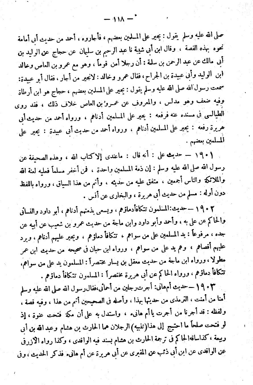 1902 - حديث المسلمون تتكافأ دماؤهم ويسعى بذمتهم أدناهم أبو داود والنسائي والحاكم عن علي به وأحمد وأبو داود وابن ماجة من حديث عمرو بن شعيب عن أبيه عن جده مرفوعا يد المسلمين على من سواهم تتكافأ دماؤهم ويجير عليهم أدناهم ويرد عليهم أقصاهم وهم يد على من سواهم ورواه بن حبان في صحيحه من حديث بن عمر مطولا ورواه بن ماجة من حديث معقل بن يسار مختصرا المسلمون يد على من سواهم تتكافأ دماؤهم ورواه الحاكم عن أبي هريرة مختصرا المسلمون تتكافأ دماؤهم