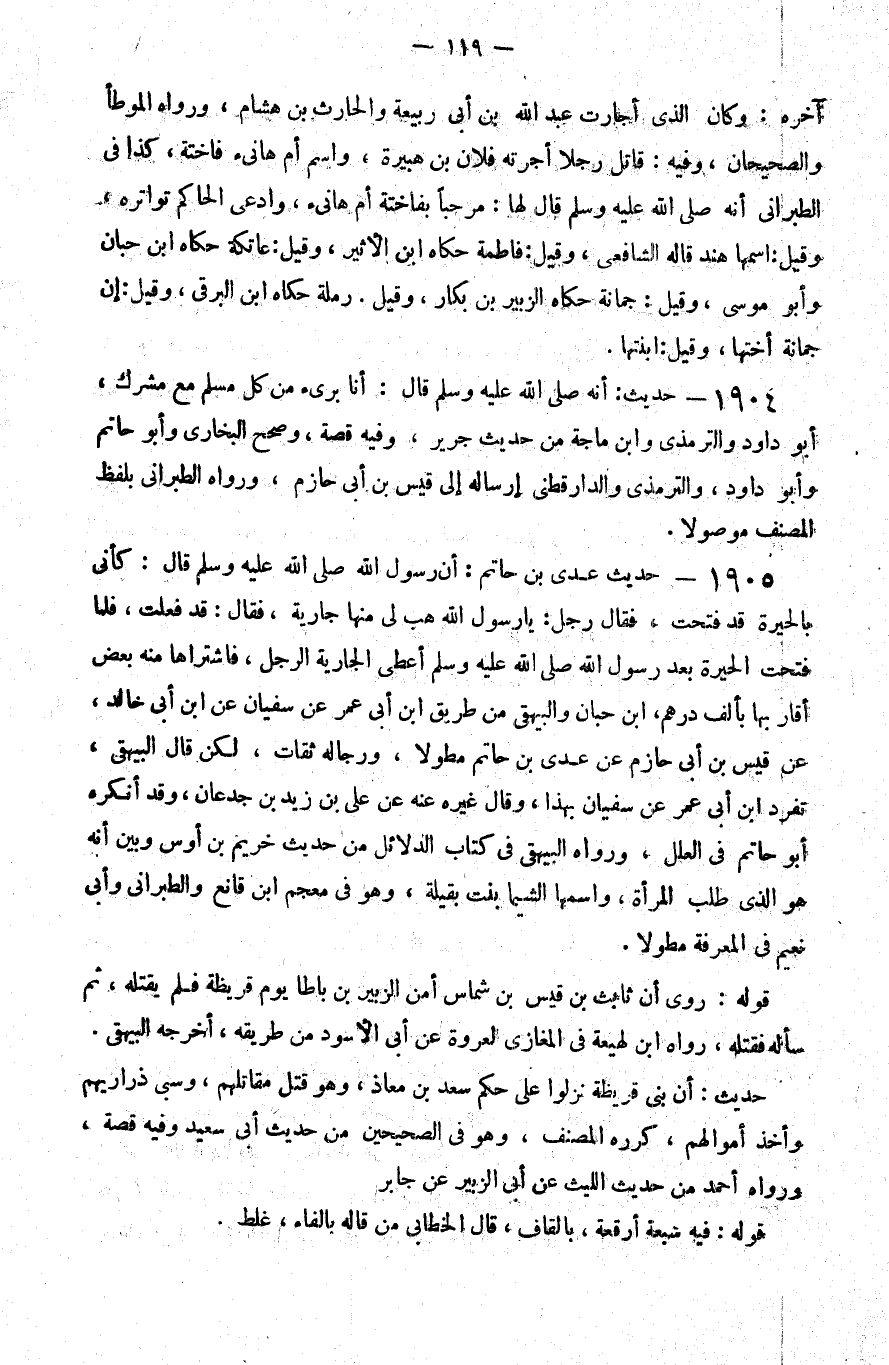 1905 - حديث عدي بن حاتم أن رسول الله صلى الله عليه و سلم قال كأني بالحيرة قد فتحت فقال رجل يا رسول الله هب لي منها جارية فقال قد فعلت فلما فتحت الحيرة بعد رسول الله صلى الله عليه و سلم أعطى الجارية الرجل فاشتراها منه بعض أقاربها بألف درهم بن حبان والبيهقي من طريق بن أبي عمر عن سفيان عن بن أبي خالد عن قيس بن أبي حازم عن عدي بن حاتم مطولا ورجاله ثقات لكن قال البيهقي تفرد بن أبي عمر عن سفيان بهذا وقال غيره عنه عن علي بن زيد بن جدعان وقد أنكره أبو حاتم في العلل ورواه البيهقي في كتاب الدلائل من حديث خريم بن أوس وبين أنه هو الذي طلب المرأة واسمها الشيماء بنت بقيلة وهو في معجم بن قانع والطبراني وأبي نعيم في المعرفة مطولا