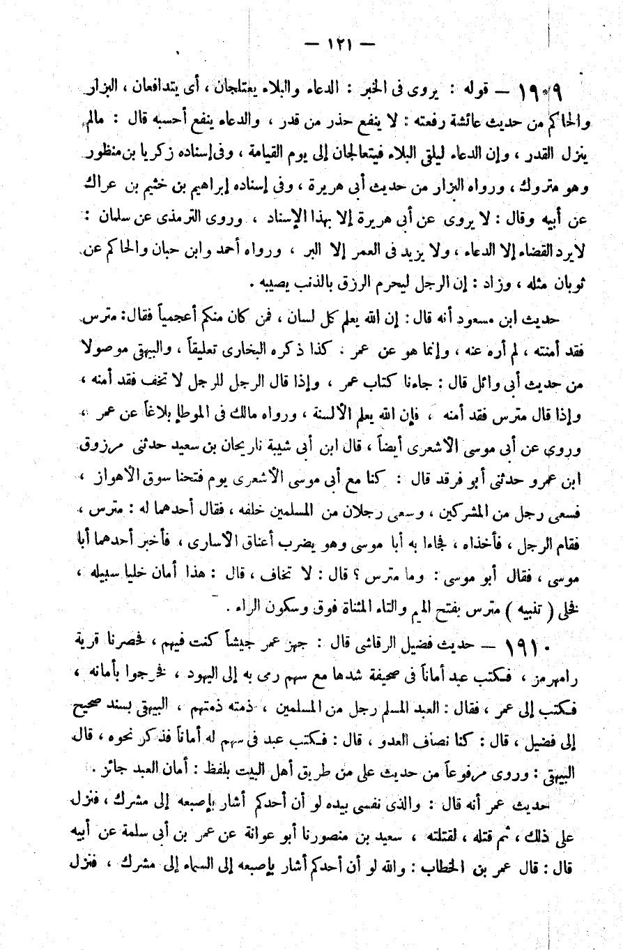1910 - حديث فضيل الرقاشي قال جهز عمر جيشا كنت فيهم فحصرنا قرية رامهرمز فكتب عبد أمانا في صحيفة شدها مع سهم رمى به إلى اليهود فخرجوا بأمانه فكتب إلى عمر فقال العبد المسلم رجل من المسلمين ذمته ذمتهم البيهقي بسند صحيح إلى فضيل قال كنا نصاف العدو قال فكتب عبد في سهم له أمانا فذكر نحوه قال البيهقي وروي مرفوعا من حديث علي من طريق أهل البيت بلفظ أمان العبد جائز
