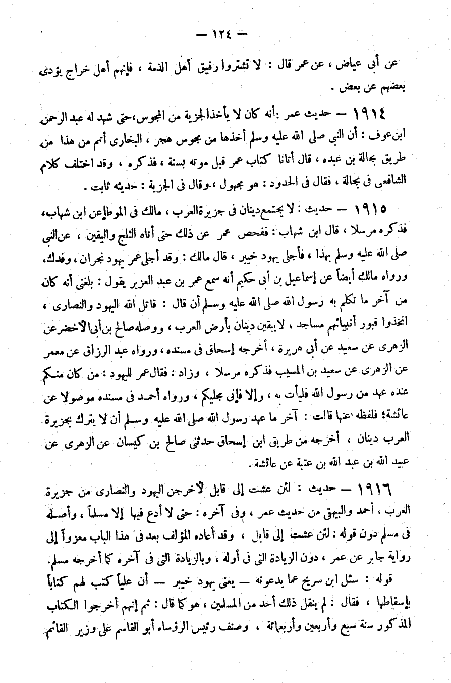 1916 - حديث لئن عشت إلى قابل لأخرجن اليهود والنصارى من جزيرة العرب أحمد والبيهقي من حديث عمر وفي آخره حتى لا أدع فيها إلا مسلما وأصله في مسلم دون قوله لئن عشت إلى قابل وقد أعاده المؤلف بعد في هذا الباب معزوا إلى رواية جابر عن عمر دون الزيادة التي في أوله وبالزيادة التي في آخره كما أخرجه مسلم