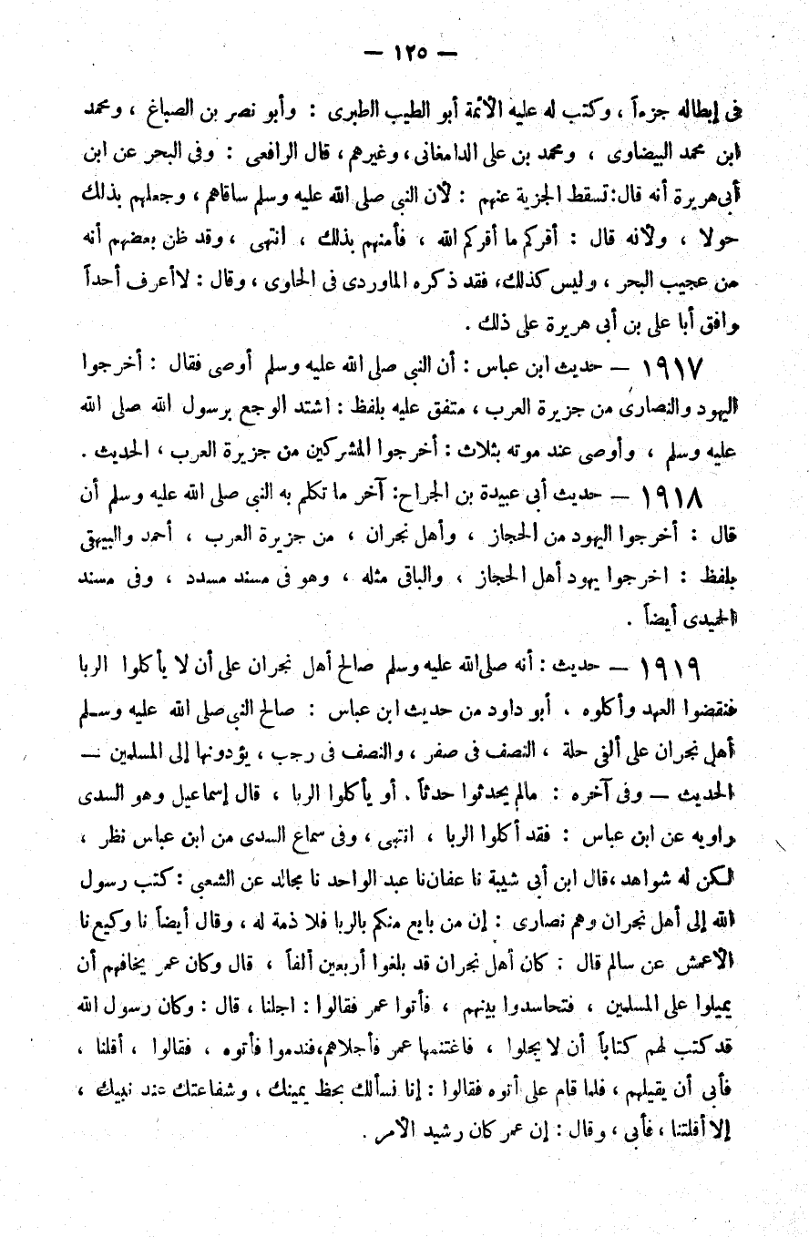 1918 - حديث أبي عبيدة بن الجراح آخر ما تكلم به النبي صلى الله عليه و سلم أن قال أخرجوا اليهود من الحجاز وأهل نجران من جزيرة العرب احمد والبيهقي بلفظ اخرجوا يهود أهل الحجاز والباقي مثله وهو في مسند مسدد وفي مسند الحميدي أيضا