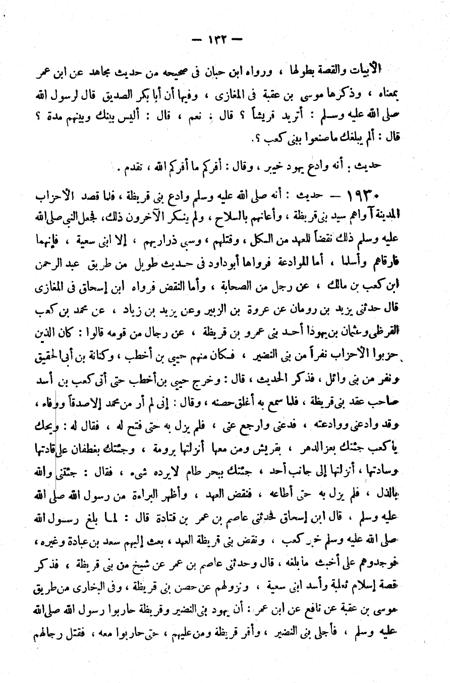 1930 - حديث أنه صلى الله عليه و سلم وادع بني قريظة فلما قصد الأحزاب المدينة آواهم سيد بني قريظة وأعانهم بالسلاح ولم ينكر الآخرون ذلك فجعل النبي صلى الله عليه و سلم ذلك نقضا للعهد من الكل وقتلهم وسبى ذراريهم إلا ابني سعية فإنهما فارقاهم واسلما أما الموادعة فرواها أبو داود في حديث طويل من طريق عبد الرحمن بن كعب بن مالك عن رجل من الصحابة وأما النقض فرواه بن إسحاق في المغازي قال حدثني يزيد بن رومان عن عروة بن الزبير وعن يزيد بن زياد عن محمد بن كعب القرظي وعثمان بن يهودا أحد بني عمرو بن قريظة عن رجال من قومه قالوا كان الذين حزبوا الأحزاب نفرا من بني النضير فكان منهم حيي بن أخطب وكنانة بن أبي الحقيق ونفر من بني وائل فذكر الحديث قال وخرج حيي بن أخطب حتى أتى كعب بن أسد صاحب عقد بني قريظة فلما سمع به أغلق حصنه وقال إني لم أر من محمد إلا صدقا ووفاء وقد وادعني ووادعته فدعني وارجع عني فلم يزل به حتى فتح له فقال له ويحك يا كعب جئتك بعز الدهر بقريش ومن معها أنزلتها برومة وجئتك بغطفان على قادتها وسادتها أنزلتها إلى جانب أحد جئتك ببحر طام لا يرده شيء فقال جئتني والله بالذل فلم يزل به حتى أطاعه فنقض العهد وأظهر البراءة من رسول الله صلى الله عليه و سلم قال بن إسحاق فحدثني عاصم بن عمر بن قتادة قال لما بلغ رسول الله صلى الله عليه و سلم خبر كعب ونقض بني قريظة العهد بعث إليهم سعد بن عبادة وغيره فوجدوهم على أخبث ما بلغه قال وحدثني عاصم بن عمر عن شيخ من بني قريظة فذكر قصة إسلام ثعلبة وأسد ابني سعية ونزولهم عن حصن بني قريظة وفي البخاري من طريق موسى بن عقبة عن نافع عن بن عمر أن يهود بني النضير وقريظة حاربوا رسول الله صلى الله عليه و سلم فأجلى بني النضير وأقر قريظة ومن عليهم حتى حاربوا معه فقتل رجالهم