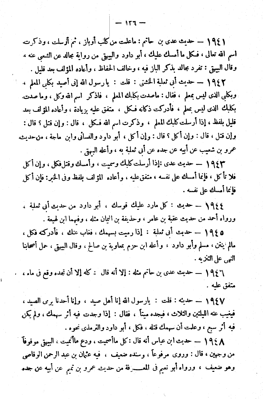 1942 - حديث أبي ثعلبة الخشني قلت يا رسول الله إني أصيد بكلبي المعلم وبكلبي الذي ليس بمعلم فقال ما صدت بكلبك المعلم فاذكر اسم الله وكل وما صدت بكلبك الذي ليس بعلم فأدركت ذكاته فكل متفق عليه بزيادة وأعاده المؤلف بعد قليل بلفظ إذا أرسلت كلبك المعلم وذكرت اسم الله فكل قال وإن قتل قال وإن قتل قال وإن أكل قال وإن أكل أبو داود والنسائي وابن ماجة من حديث عمرو بن شعيب عن أبيه عن جده عن أبي ثعلبة به واعله البيهقي