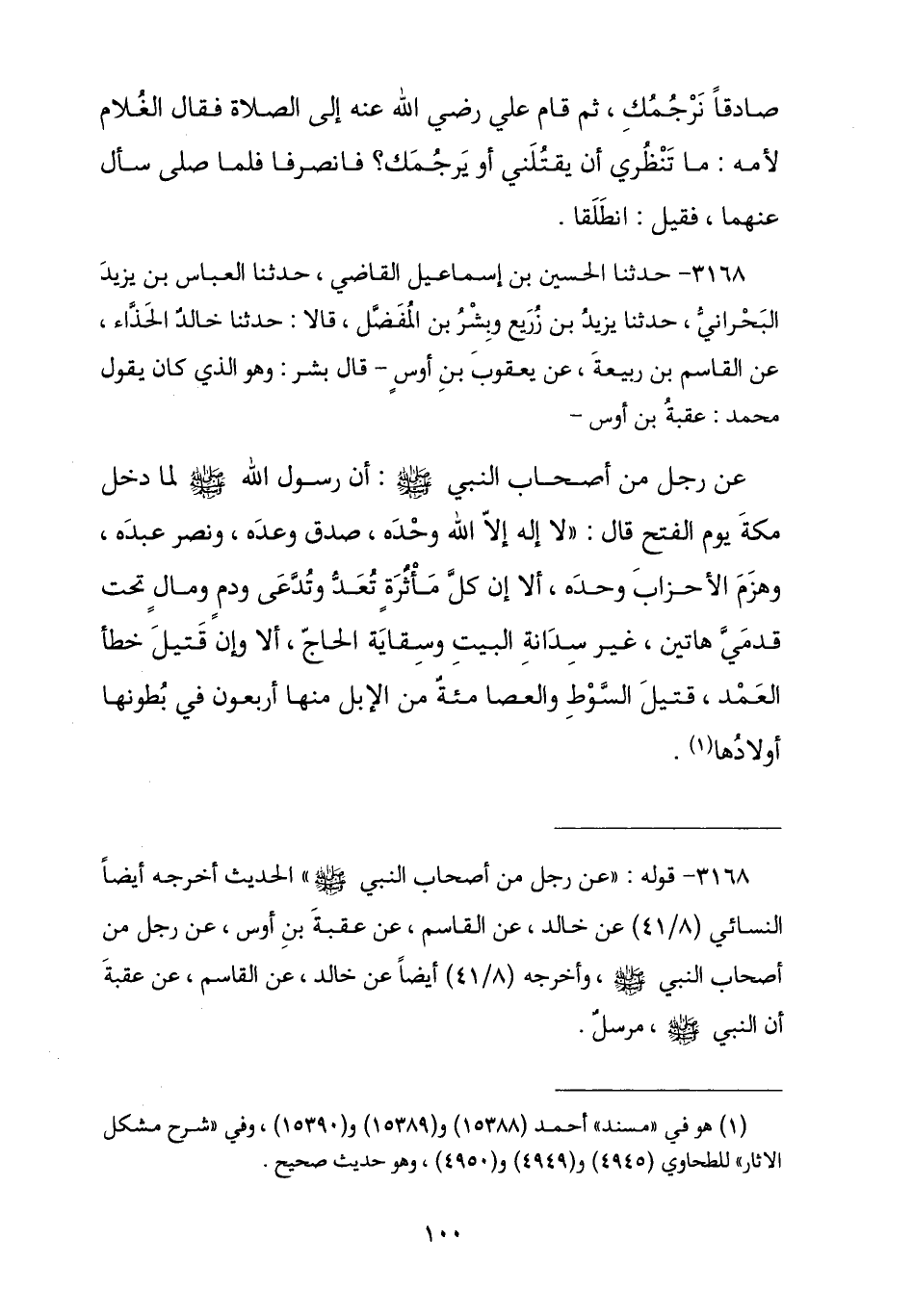 3168 - حَدَّثَنَا الْحُسَيْنُ بْنُ إِسْمَاعِيلَ الْقَاضِي , نا الْعَبَّاسُ بْنُ يَزِيدَ الْبَحْرَانِيُّ , نا يَزِيدُ بْنُ زُرَيْعٍ , وَبِشْرُ بْنُ الْمُفَضَّلِ , قَالَا: نا خَالِدٌ الْحَذَّاءُ , عَنِ الْقَاسِمِ بْنِ رَبِيعَةَ , عَنْ يَعْقُوبَ بْنِ أَوْسٍ , قَالَ بِشْرٌ: وَهُوَ الَّذِي كَانَ يَقُولُ مُحَمَّدُ بْنُ عُقْبَةَ بْنِ أَوْسٍ , عَنْ رَجُلٍ مِنْ أَصْحَابِ النَّبِيِّ صَلَّى اللهُ عَلَيْهِ وَسَلَّمَ , أَنَّ رَسُولَ اللَّهِ صَلَّى اللهُ عَلَيْهِ وَسَلَّمَ لَمَّا دَخَلَ مَكَّةَ يَوْمَ الْفَتْحِ , قَالَ: § «لَا إِلَهَ إِلَّا اللَّهُ وَحْدَهُ , صَدَقَ وَعْدَهُ , وَنَصَرَ عَبْدَهُ , وَهَزَمَ الْأَحْزَابَ وَحْدَهُ , أَلَا إِنَّ كُلَّ مَأْثُرَةٍ تُعَدُّ وَتُدْعَى وَدَمٍ وَمَالٍ تَحْتَ قَدَمَيَّ هَاتَيْنِ , غَيْرَ سِدَانَةِ الْبَيْتِ وَسِقَايَةِ الْحَاجِّ , أَلَا وَإِنَّ فِي قَتِيلِ خَطَأِ الْعَمْدِ قَتِيلِ السَّوْطِ وَالْعَصَا مِائَةً مِنَ الْإِبِلِ , مِنْهَا أَرْبَعُونَ فِي بُطُونِهَا أَوْلَادُهَا»