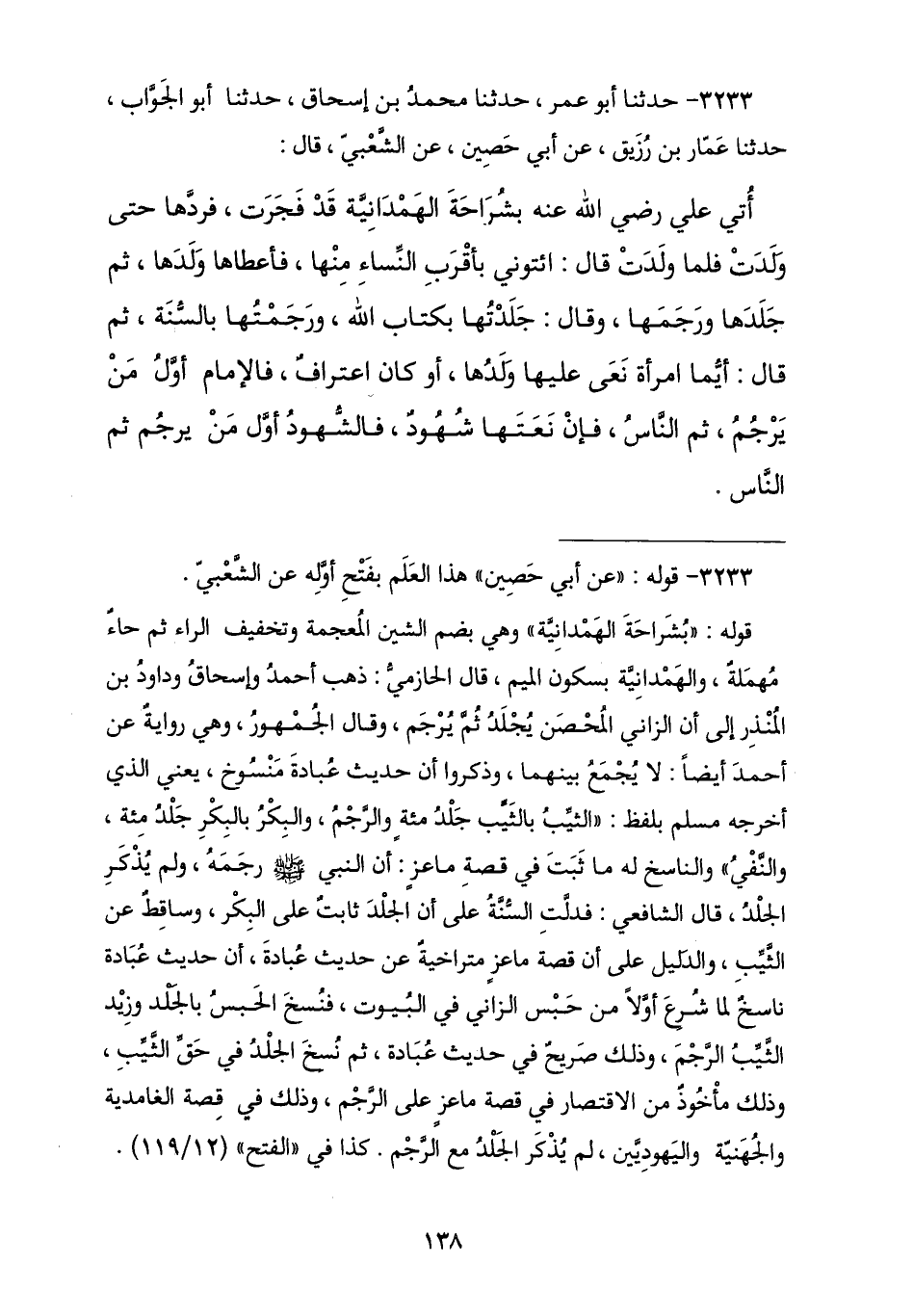 3233 - نا أَبُو عُمَرَ , نا مُحَمَّدُ بْنُ إِسْحَاقَ , نا أَبُو الْجَوَّابِ , نا عَمَّارُ بْنُ رُزَيْقٍ , عَنْ أَبِي حُصَيْنٍ , عَنِ الشَّعْبِيِّ , قَالَ: أُتِيَ عَلِيٌّ رَضِيَ اللَّهُ عَنْهُ بِشِرَاحَةَ الْهَمْدَانِيَّةِ قَدْ فَجَرَتْ , فَرَدَّهَا حَتَّى وَلَدَتْ فَلَمَّا وَلَدَتْ , قَالَ: «ائْتُونِي بِأَقْرَبِ النِّسَاءِ مِنْهَا» , فَأَعْطَاهَا وَلَدَهَا ثُمَّ جَلَدَهَا وَرَجَمَهَا , وَقَالَ: § «جَلَدْتُهَا بِكِتَابِ اللَّهِ , وَرَجَمْتُهَا بِالسُّنَّةِ» , ثُمَّ قَالَ: «أَيُّمَا امْرَأَةٍ نُعِيَ عَلَيْهَا وَلَدُهَا أَوْ كَانَ اعْتِرَافٌ , فَالْإِمَامُ أَوَّلُ مَنْ يَرْجُمُ , ثُمَّ النَّاسُ , فَإِنْ نَعَتَهَا شُهُودٌ فَالشُّهُودُ أَوَّلُ مَنْ يَرْجُمُ ثُمَّ النَّاسُ»