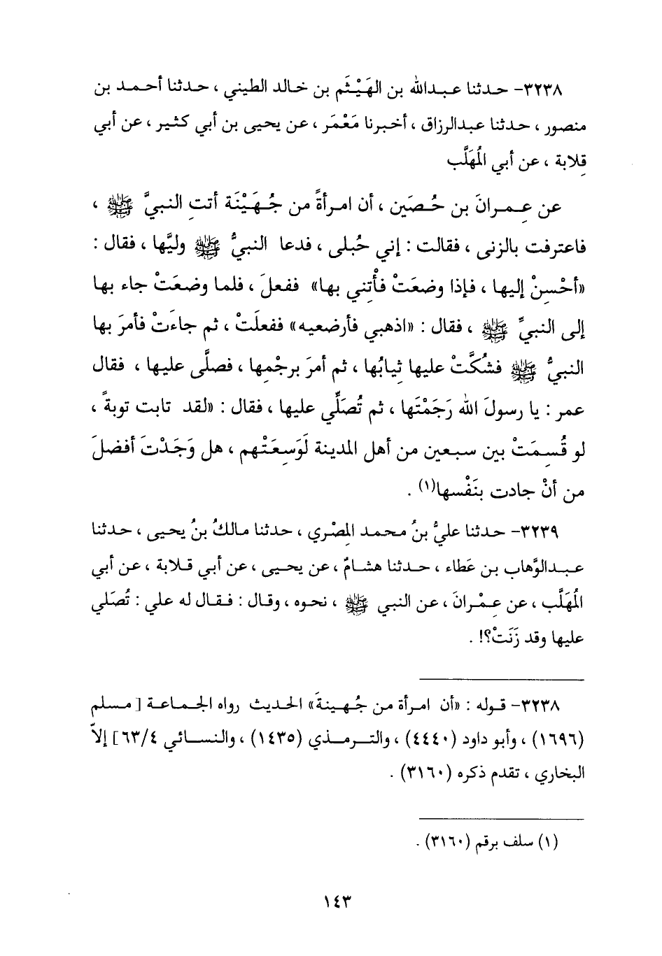 3238 - نا عَبْدُ اللَّهِ بْنُ الْهَيْثَمِ بْنِ خَالِدٍ الطَّيِّنِيُّ , نا أَحْمَدُ بْنُ مَنْصُورٍ , نا عَبْدُ الرَّزَّاقِ , أنا مَعْمَرٌ , عَنْ يَحْيَى بْنِ أَبِي كَثِيرٍ , عَنْ أَبِي قِلَابَةَ , عَنْ أَبِي الْمُهَلَّبِ , عَنْ عِمْرَانَ بْنِ حُصَيْنٍ: أَنَّ امْرَأَةً مِنْ جُهَيْنَةَ أَتَتِ النَّبِيَّ صَلَّى اللهُ عَلَيْهِ وَسَلَّمَ فَاعْتَرَفَتْ بِالزِّنَا , فَقَالَتْ: «إِنِّي حُبْلَى» , فَدَعَا النَّبِيُّ صَلَّى اللهُ عَلَيْهِ وَسَلَّمَ وَلِيَّهَا , فَقَالَ: «§أَحْسِنْ إِلَيْهَا , فَإِذَا وَضَعَتْ فَأْتِنِي بِهَا» فَفَعَلَ , فَلَمَّا وَضَعَتْ جَاءَ بِهَا إِلَى النَّبِيِّ صَلَّى اللهُ عَلَيْهِ وَسَلَّمَ , فَقَالَ: «اذْهَبِي فَأَرْضِعِيهِ» فَفَعَلَتْ , ثُمَّ جَاءَتْ فَأَمَرَ بِهَا النَّبِيُّ صَلَّى اللهُ عَلَيْهِ وَسَلَّمَ فَشُكَّتْ عَلَيْهَا ثِيَابُهَا ثُمَّ أَمَرَ بِرَجْمِهَا فَصَلَّى عَلَيْهَا , فَقَالَ عُمَرُ رَضِيَ اللَّهُ عَنْهُ: يَا رَسُولَ اللَّهِ رَجَمْتَهَا ثُمَّ تُصَلِّي عَلَيْهَا؟ , فَقَالَ: «لَقَدْ تَابَتْ تَوْبَةً لَوْ قُسِمَتْ بَيْنَ سَبْعِينَ مِنْ أَهْلِ الْمَدِينَةِ لَوَسِعَتْهُمْ , هَلْ وَجَدْتَ أَفْضَلَ مِنْ أَنْ جَادَتْ بِنَفْسِهَا».