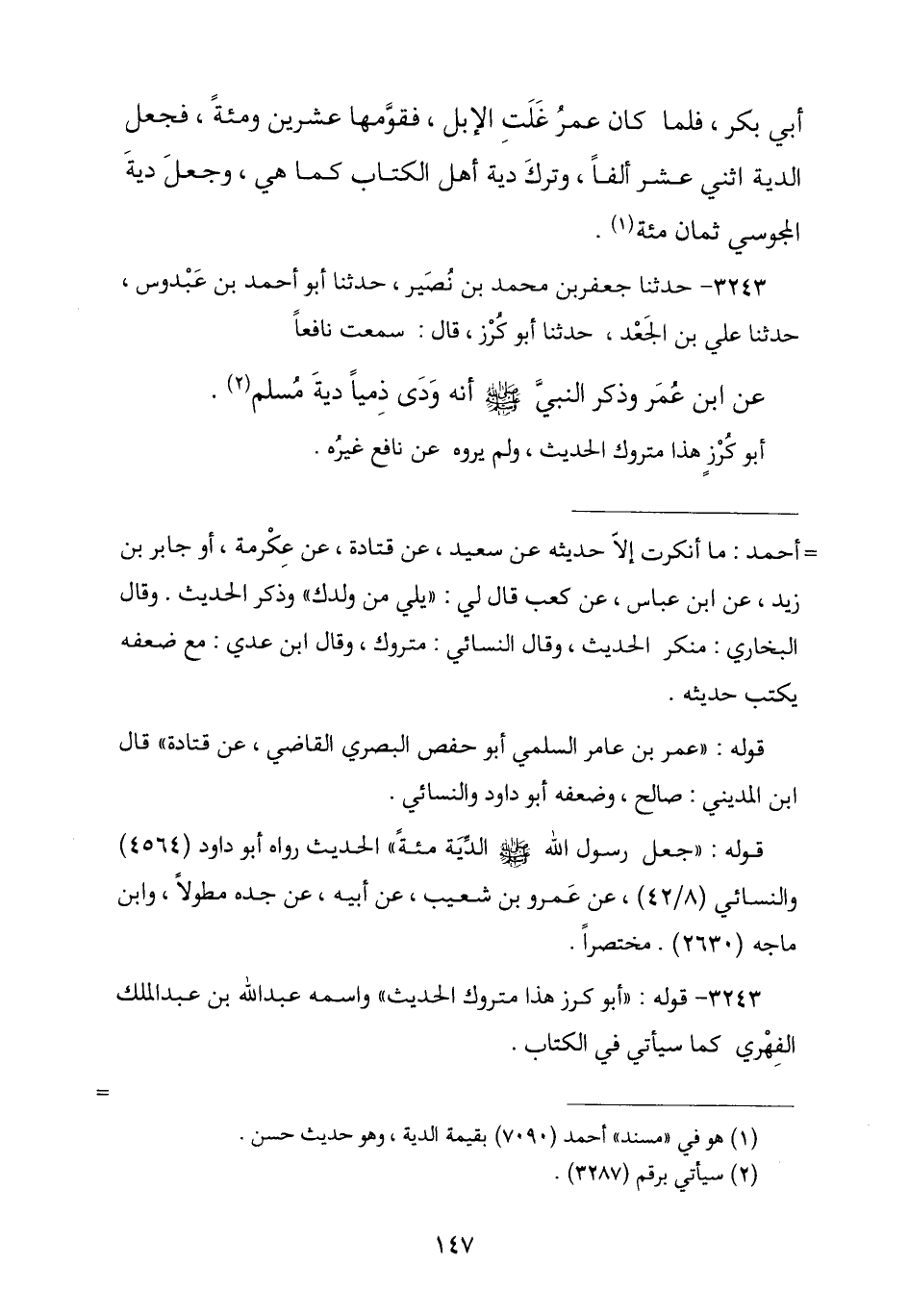 3243 - نا جَعْفَرُ بْنُ مُحَمَّدِ بْنِ نُصَيْرٍ , نا أَبُو أَحْمَدَ بْنُ عَبْدُوسَ , نا عَلِيُّ بْنُ الْجَعْدِ , نا أَبُو كُرْزٍ , قَالَ: سَمِعْتُ نَافِعًا , عَنِ ابْنِ عُمَرَ , ذَكَرَ النَّبِيَّ صَلَّى اللهُ عَلَيْهِ وَسَلَّمَ «أَنَّهُ §وَدَى ذِمِّيًّا دِيَةَ مُسْلِمٍ». أَبُو كُرْزٍ هَذَا مَتْرُوكُ الْحَدِيثِ , وَلَمْ يَرْوِهِ عَنْ نَافِعٍ غَيْرُهُ