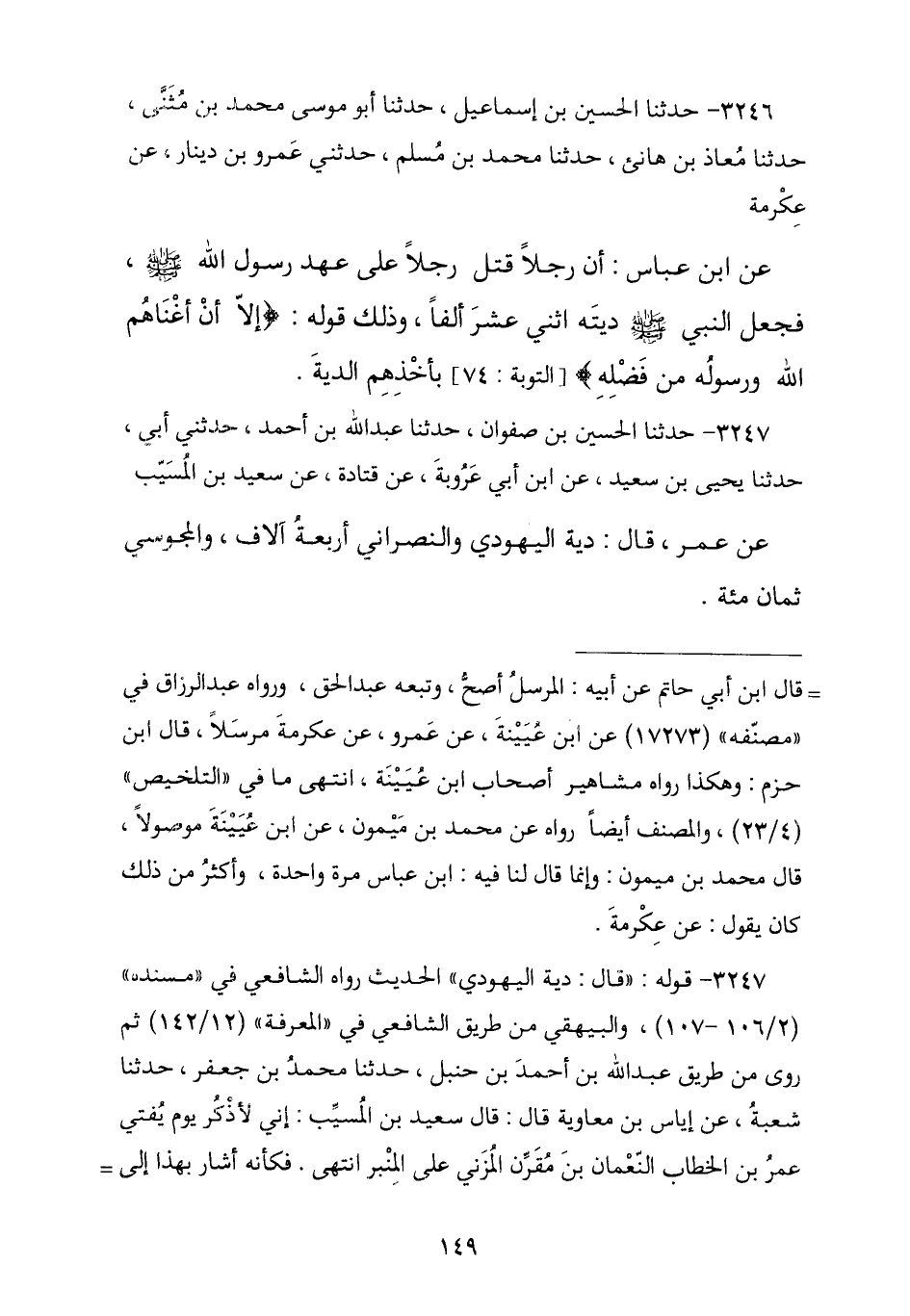 3246 - نا الْحُسَيْنُ بْنُ إِسْمَاعِيلَ , نا أَبُو مُوسَى , مُحَمَّدُ بْنُ مَثْنَى , نا مُعَاذُ بْنُ هَانِئٍ , نا مُحَمَّدُ بْنُ مُسْلِمٍ , حَدَّثَنِي عَمْرُو بْنُ دِينَارٍ , عَنْ عِكْرِمَةَ , عَنِ ابْنِ عَبَّاسٍ , أَنَّ رَجُلًا قَتَلَ رَجُلًا عَلَى عَهْدِ رَسُولِ اللَّهِ صَلَّى اللهُ عَلَيْهِ وَسَلَّمَ , " فَجَعَلَ النَّبِيُّ صَلَّى اللهُ عَلَيْهِ وَسَلَّمَ §دِيَتَهُ اثْنَا عَشَرَ أَلْفًا , وَذَلِكَ قَوْلُهُ: {إِلَّا أَنْ أَغْنَاهُمُ اللَّهُ وَرَسُولُهُ مِنْ فَضْلِهِ} [التوبة: 74] بِأَخْذِهِمُ الدِّيَةَ "