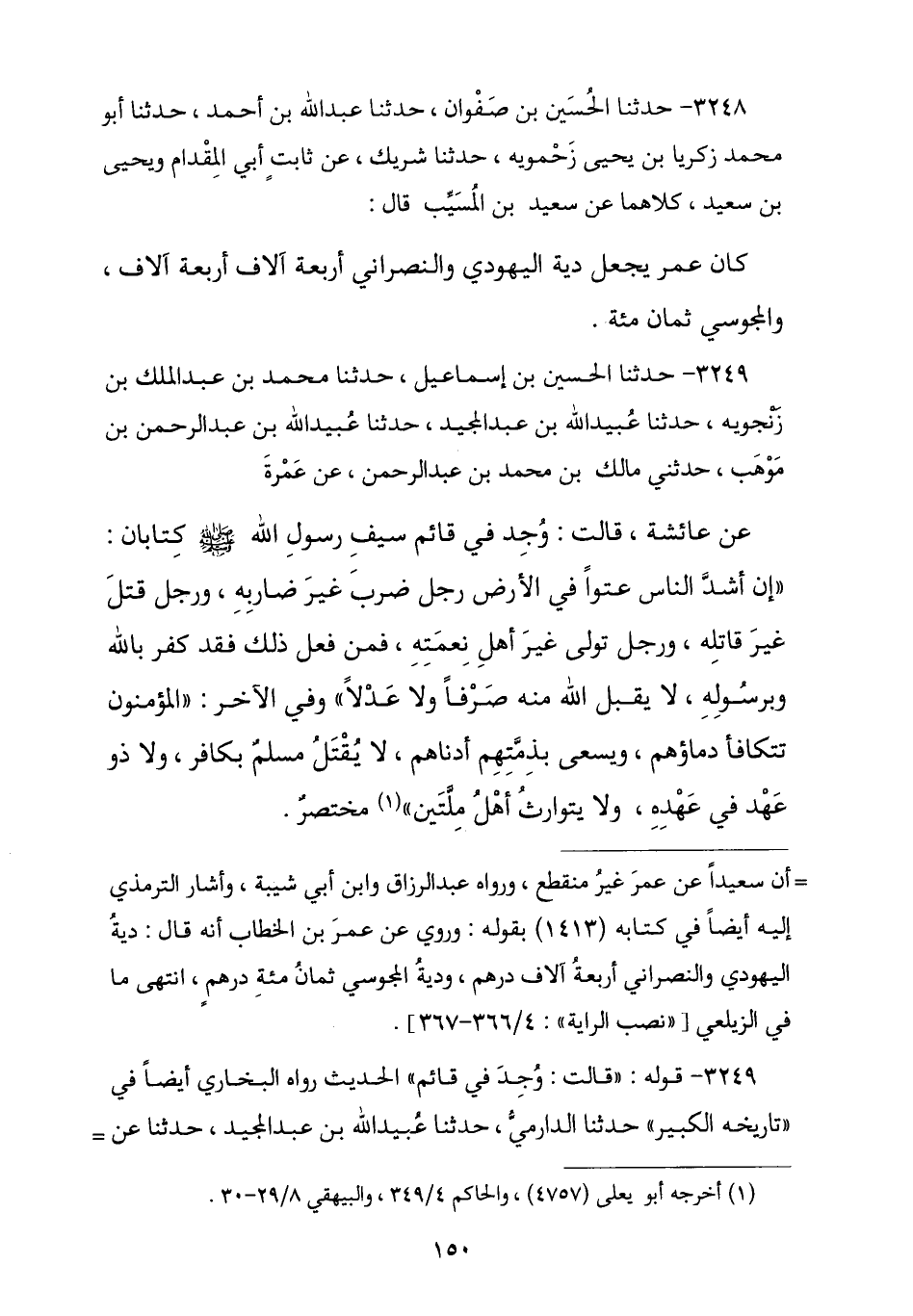 3249 - نا الْحُسَيْنُ بْنُ إِسْمَاعِيلَ , نا مُحَمَّدُ بْنُ عَبْدِ الْمَلِكِ بْنِ زَنْجُوَيْهِ , نا عُبَيْدُ اللَّهِ بْنُ عَبْدِ الْمَجِيدِ , نا عُبَيْدُ اللَّهِ بْنُ عَبْدِ الرَّحْمَنِ بْنِ مَوْهَبٍ , حَدَّثَنِي مَالِكُ بْنُ مُحَمَّدِ بْنِ عَبْدِ الرَّحْمَنِ , عَنْ عَمْرَةَ , عَنْ عَائِشَةَ , قَالَتْ: وُجِدَ فِي قَائِمِ سَيْفِ رَسُولِ اللَّهِ صَلَّى اللهُ عَلَيْهِ وَسَلَّمَ كِتَابَانِ: § «إِنَّ أَشَدَّ النَّاسِ عُتُوًّا فِي الْأَرْضِ رَجُلٌ ضَرَبَ غَيْرَ ضَارِبِهِ , وَرَجُلٌ قَتَلَ غَيْرَ قَاتِلِهِ , وَرَجُلٌ تَوَلَّى غَيْرَ أَهْلِ نِعْمَتِهِ , فَمَنْ فَعَلَ ذَلِكَ فَقَدْ كَفَرَ بِاللَّهِ وَبِرُسُلِهِ , لَا يَقْبَلُ اللَّهُ مِنْهُ صَرْفًا وَلَا عَدْلًا» وَفِي الْآخَرِ: «الْمُؤْمِنُونَ تَتَكَافَأُ دِمَاؤُهُمْ , وَيَسْعَى بِذِمَّتِهِمْ أَدْنَاهُمْ , لَا يُقْتَلُ مُسْلِمٌ بِكَافِرٍ , وَلَا ذُو عَهْدٍ فِي عَهْدِهِ , وَلَا يَتَوَارَثُ أَهْلُ مِلَّتَيْنِ» مُخْتَصَرٌ
