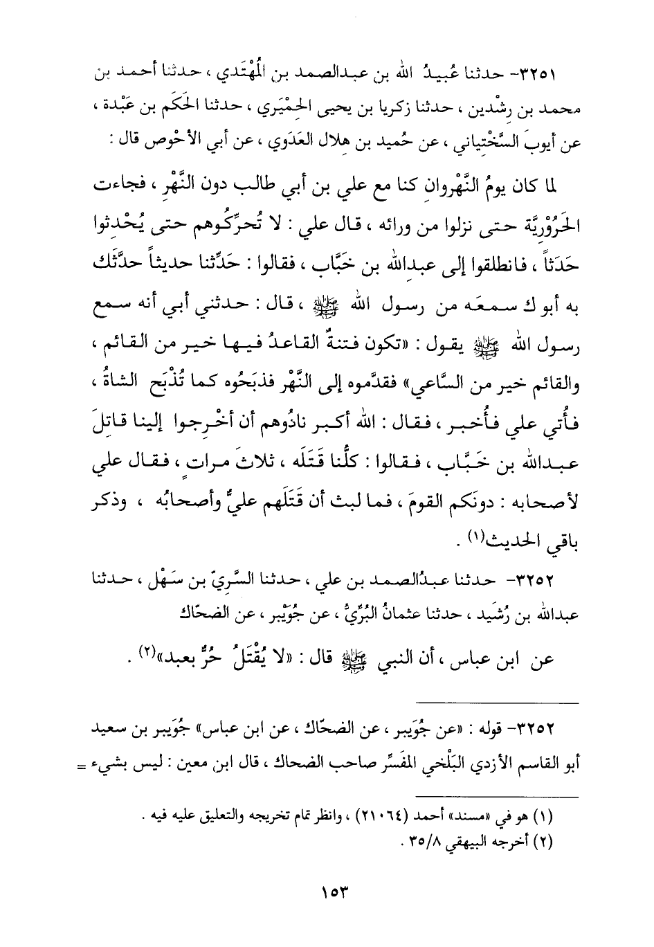 3251 - نا عُبَيْدُ اللَّهِ بْنُ عَبْدِ الصَّمَدِ بْنِ الْمُهْتَدِي , نا أَحْمَدُ بْنُ مُحَمَّدِ بْنِ رِشْدِينَ , نا زَكَرِيَّا بْنُ يَحْيَى الْحِمْيَرِيُّ , نا الْحَكَمُ بْنُ عَبْدَةَ , عَنْ أَيُّوبَ السَّخْتِيَانِيِّ , عَنْ حُمَيْدِ بْنِ هِلَالٍ الْعَدَوِيِّ , عَنْ أَبِي الْأَحْوَصِ , قَالَ: لَمَّا كَانَ يَوْمُ النَّهْرَوَانِ كُنَّا مَعَ عَلِيِّ بْنِ أَبِي طَالِبٍ رَضِيَ اللَّهُ عَنْهُ دُونَ النَّهَرِ , فَجَاءَتِ الْحَرُورِيَّةُ حَتَّى نَزَلُوا مِنْ وَرَائِهِ , قَالَ عَلِيٌّ: لَا تُحَرِّكُوهُمْ حَتَّى يُحْدِثُوا حَدَثًا , فَانْطَلَقُوا إِلَى عَبْدِ اللَّهِ بْنِ خَبَّابٍ , فَقَالُوا: حَدِّثْنَا حَدِيثًا حَدَّثَكَ بِهِ أَبُوكَ سَمِعَهُ مِنْ رَسُولِ اللَّهِ صَلَّى اللهُ عَلَيْهِ وَسَلَّمَ , قَالَ: حَدَّثَنِي أَبِي , أَنَّهُ سَمِعَ رَسُولَ اللَّهِ صَلَّى اللهُ عَلَيْهِ وَسَلَّمَ قَالَ: حَدَّثَنِي: § «تَكُونُ فِتْنَةٌ الْقَاعِدُ فِيهَا خَيْرٌ مِنَ الْقَائِمِ , وَالْقَائِمُ خَيْرٌ مِنَ السَّاعِي». فَقَدَّمُوهُ إِلَى النَّهَرِ فَذَبَحُوهُ كَمَا تُذْبَحُ الشَّاةُ , فَأُتِيَ عَلِيٌّ رَضِيَ اللَّهُ عَنْهُ فَأُخْبِرَ , فَقَالَ: اللَّهُ أَكْبَرُ , نَادُوهُمْ أَنْ أَخْرِجُوا إِلَيْنَا قَاتَلَ عَبْدِ اللَّهِ بْنِ خَبَّابٍ , فَقَالُوا: كُلُّنَا قَتَلَهُ , ثَلَاثَ مَرَّاتٍ , فَقَالَ عَلِيٌّ رَضِيَ اللَّهُ عَنْهُ لِأَصْحَابِهِ: دُونَكُمُ الْقَوْمُ , فَمَا لَبِثَ أَنْ قَتَلَهُمُ عَلِيٌّ وَأَصْحَابُهُ , وَذَكَرَ بَاقِيَ الْحَدِيثِ