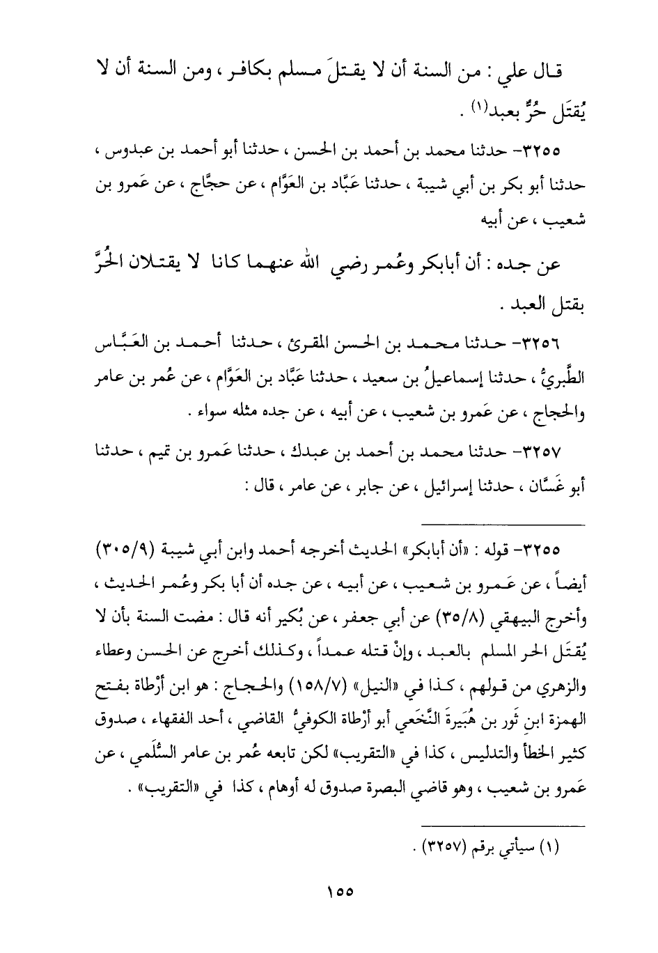 3255 - نا مُحَمَّدُ بْنُ أَحْمَدَ بْنِ الْحَسَنِ , نا أَبُو أَحْمَدَ بْنُ عَبْدُوسَ , نا أَبُو بَكْرِ بْنُ أَبِي شَيْبَةَ , نا عَبَّادُ بْنُ الْعَوَّامِ , عَنْ حَجَّاجٍ , عَنْ عَمْرِو بْنِ شُعَيْبٍ , عَنْ أَبِيهِ , عَنْ جَدِّهِ , أَنَّ أَبَا بَكْرٍ , وَعُمَرَ , رَضِيَ اللَّهُ عَنْهُمَا § «كَانَا لَا يَقْتُلَانِ الْحُرَّ بِقَتْلِ الْعَبْدِ».