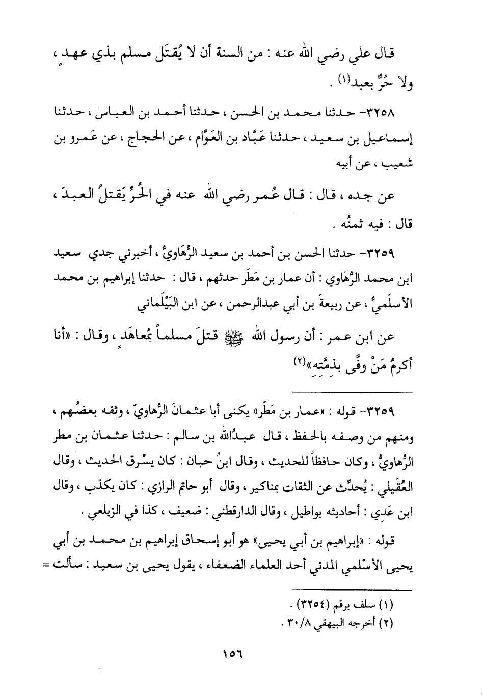 3259 - نا الْحَسَنُ بْنُ أَحْمَدَ بْنِ سَعِيدٍ الرَّهَاوِيُّ , أَخْبَرَنِي جَدِّي سَعِيدُ بْنُ مُحَمَّدٍ الرَّهَاوِيُّ , أَنَّ عَمَّارَ بْنَ مَطَرٍ حَدَّثَهُمْ , نا إِبْرَاهِيمُ بْنُ مُحَمَّدٍ الْأَسْلَمِيُّ , عَنْ رَبِيعَةَ بْنِ أَبِي عَبْدِ الرَّحْمَنِ , عَنِ ابْنِ الْبَيْلَمَانِيِّ , عَنِ ابْنِ عُمَرَ , أَنَّ رَسُولَ اللَّهِ صَلَّى اللهُ عَلَيْهِ وَسَلَّمَ قَتَلَ مُسْلِمًا بِمُعَاهَدٍ , وَقَالَ: § «أَنَا أَكْرَمُ مَنْ وَفَى بِذِمَّتِهِ» -[157]- لَمْ يُسْنِدْهُ غَيْرُ إِبْرَاهِيمَ بْنِ أَبِي يَحْيَى وَهُوَ مَتْرُوكُ الْحَدِيثِ، وَالصَّوَابُ عَنْ رَبِيعَةَ، عَنِ ابْنِ الْبَيْلَمَانِيِّ مُرْسَلٌ عَنِ النَّبِيِّ صَلَّى اللهُ عَلَيْهِ وَسَلَّمَ، وَابْنُ الْبَيْلَمَانِيِّ ضَعِيفٌ لَا تَقُومُ بِهِ حُجَّةٌ إِذَا وَصَلَ الْحَدِيثَ فَكَيْفَ بِمَا يُرْسِلُهُ وَاللَّهُ أَعْلَمُ
