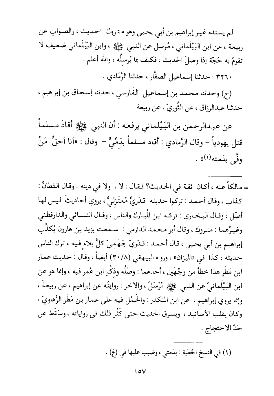 3260 - ثنا إِسْمَاعِيلُ الصَّفَّارُ , نا الرَّمَادِيُّ , ح وَنا مُحَمَّدُ بْنُ إِسْمَاعِيلَ الْفَارِسِيُّ , نا إِسْحَاقُ بْنُ إِبْرَاهِيمَ , قَالَا: نا عَبْدُ الرَّزَّاقِ , عَنِ الثَّوْرِيِّ , عَنْ رَبِيعَةَ , عَنْ عَبْدِ الرَّحْمَنِ بْنِ الْبَيْلَمَانِيِّ , يَرْفَعْهُ أَنَّ النَّبِيَّ صَلَّى اللهُ عَلَيْهِ وَسَلَّمَ «§أَقَادَ مُسْلِمًا قَتَلَ يَهُودِيًّا». وَقَالَ الرَّمَادِيُّ: أَقَادَ مُسْلِمًا بِذِمِّيٍّ , وَقَالَ: «أَنَا أَحَقُّ مَنْ وَفَّى بِذِمَّتِهِ»