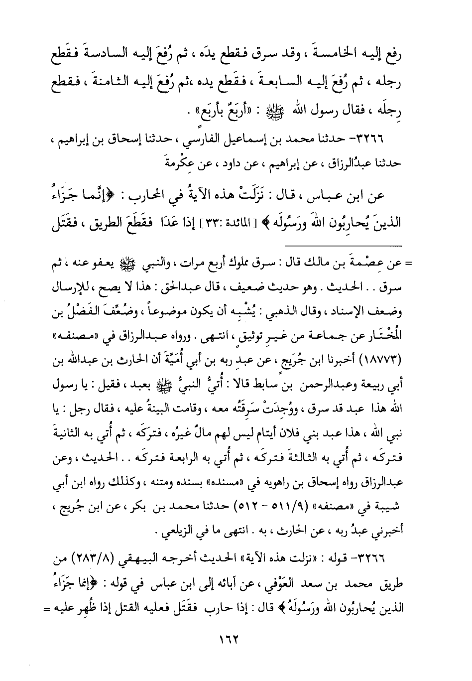 3266 - نا مُحَمَّدُ بْنُ إِسْمَاعِيلَ الْفَارِسِيُّ , نا إِسْحَاقُ بْنُ إِبْرَاهِيمَ , نا عَبْدُ الرَّزَّاقِ , عَنْ إِبْرَاهِيمَ , عَنْ دَاوُدَ , عَنْ عِكْرِمَةَ , عَنِ ابْنِ عَبَّاسٍ , قَالَ: " §نَزَلَتْ هَذِهِ الْآيَةُ فِي الْمُحَارِبِ {إِنَّمَا جَزَاءُ الَّذِينَ يُحَارِبُونَ اللَّهَ وَرَسُولَهُ} [المائدة: 33] إِذَا عَدَا فَقَطَعَ الطَّرِيقَ فَقَتَلَ -[163]- وَأَخَذَ الْمَالَ صُلِبَ , فَإِنْ قَتَلَ وَلَمْ يَأْخُذْ مَالًا قُتِلَ , فَإِنْ أَخَذَ الْمَالَ وَلَمْ يَقْتُلْ قُطِعَ مِنْ خِلَافٍ , فَإِنْ هَرَبَ وَأَعْجَزَهُمْ فَذَلِكَ نَفْيُهُ "