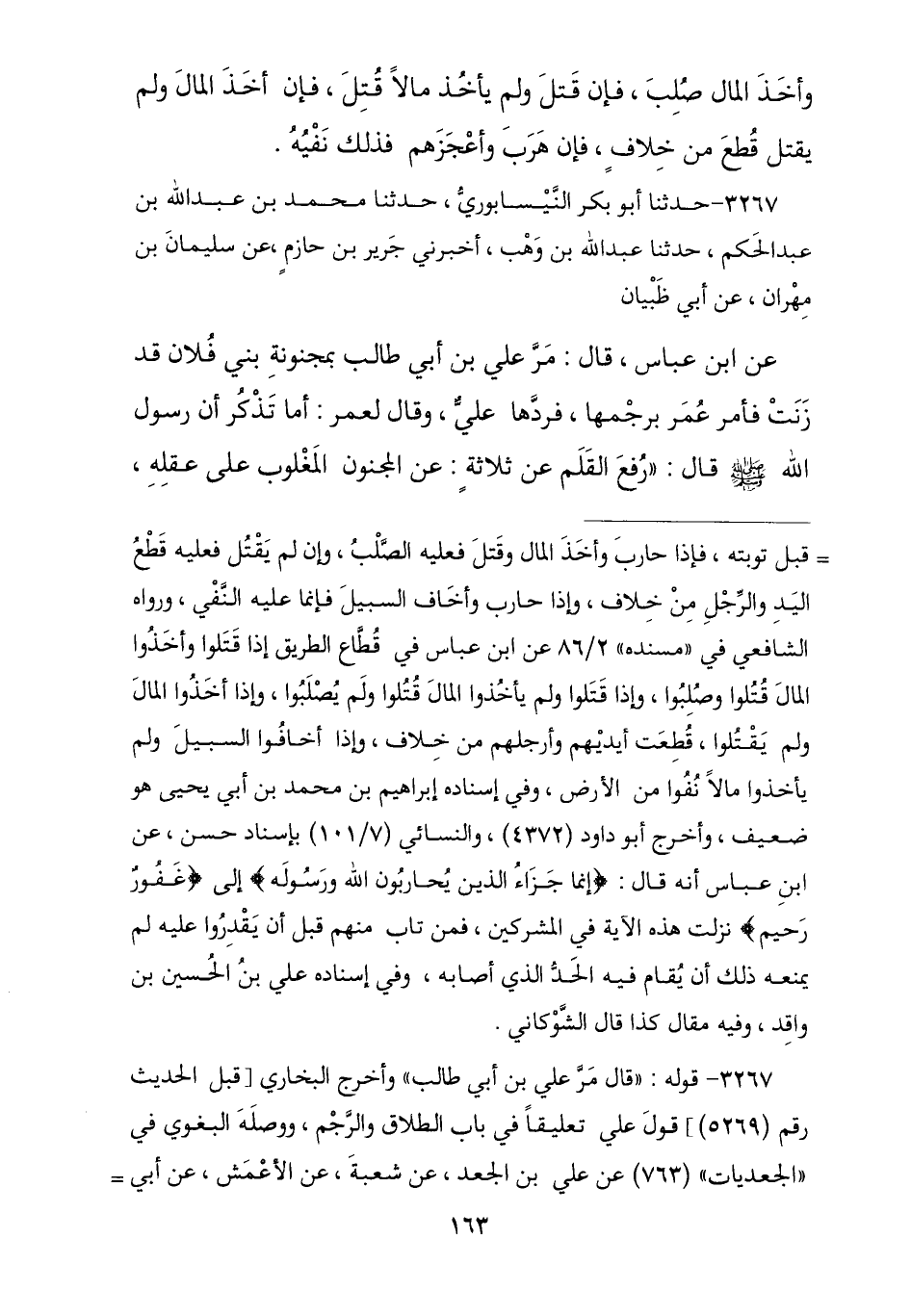 3267 - نا أَبُو بَكْرٍ النَّيْسَابُورِيُّ , نا مُحَمَّدُ بْنُ عَبْدِ اللَّهِ بْنِ عَبْدِ الْحَكَمِ , نا عَبْدُ اللَّهِ بْنُ وَهْبٍ , أَخْبَرَنِي جَرِيرُ بْنُ حَازِمٍ , عَنْ سُلَيْمَانَ بْنِ مِهْرَانَ , عَنْ أَبِي ظَبْيَانَ , عَنِ ابْنِ عَبَّاسٍ , قَالَ: مَرَّ عَلِيُّ بْنُ أَبِي طَالِبٍ بِمَجْنُونَةِ بَنِي فُلَانٍ قَدْ زَنَتْ , فَأَمَرَ عُمَرُ بِرَجْمِهَا , فَرَدَّهَا عَلِيُّ , وَقَالَ لِعُمَرَ: أَمَا تَذْكُرُ أَنَّ رَسُولَ اللَّهِ صَلَّى اللهُ عَلَيْهِ وَسَلَّمَ , قَالَ: § «رُفِعَ الْقَلَمُ عَنْ ثَلَاثَةٍ , عَنِ الْمَجْنُونِ الْمَغْلُوبِ عَلَى عَقْلِهِ , -[164]- وَعَنِ النَّائِمِ حَتَّى يَسْتَيْقِظَ , وَعَنِ الصَّبِيِّ حَتَّى يَحْتَلِمَ» , قَالَ: صَدَقْتَ , فَخَلَّى عَنْهَا