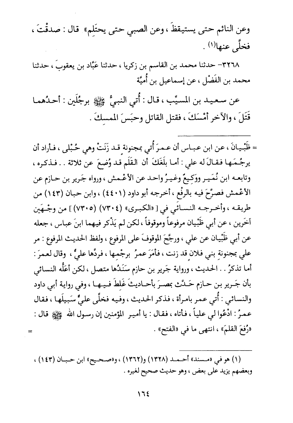 3268 - نا مُحَمَّدُ بْنُ الْقَاسِمِ بْنِ زَكَرِيَّا , نا عَبَّادُ بْنُ يَعْقُوبَ , نا مُحَمَّدُ بْنُ الْفَضْلِ , عَنْ إِسْمَاعِيلَ بْنِ أُمَيَّةَ , عَنْ سَعِيدِ بْنِ الْمُسَيِّبِ , قَالَ: أُتِيَ النَّبِيُّ صَلَّى اللهُ عَلَيْهِ وَسَلَّمَ بِرَجُلَيْنِ أَحَدُهُمَا قَتَلَ , وَالْآخَرُ أَمْسَكَ , § «فَقَتَلَ الَّذِي قَتَلَ , وَحَبَسَ الْمُمْسِكَ»