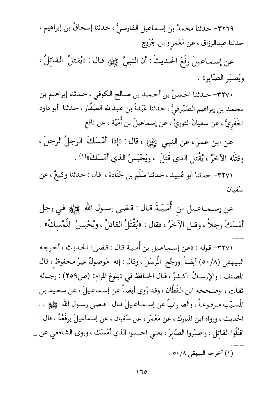 3270 - نا الْحَسَنُ بْنُ أَحْمَدَ بْنِ صَالِحٍ الْكُوفِيُّ , نا إِبْرَاهِيمُ بْنُ مُحَمَّدِ بْنِ إِبْرَاهِيمَ الصَّيْرَفِيُّ , نا عَبْدَةُ بْنُ عَبْدِ اللَّهِ الصَّفَّارُ , نا أَبُو دَاوُدَ الْحَفَرِيُّ , عَنْ سُفْيَانَ الثَّوْرِيِّ , عَنْ إِسْمَاعِيلَ بْنِ أُمَيَّةَ , عَنْ نَافِعٍ , عَنِ ابْنِ عُمَرَ , عَنِ النَّبِيِّ صَلَّى اللهُ عَلَيْهِ وَسَلَّمَ: § «إِذَا أَمْسَكَ الرَّجُلُ الرَّجُلَ وَقَتَلَهُ الْآخَرُ يُقْتَلُ الَّذِي قَتَلَ , وَيُحْبَسُ الَّذِي أَمْسَكَ»
