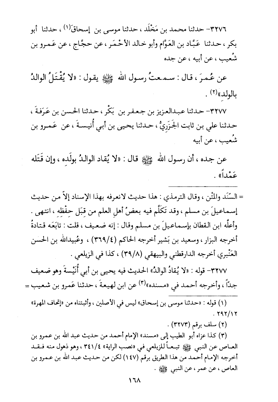 3276 - نا مُحَمَّدُ بْنُ مَخْلَدٍ , نا مُوسَى بْنُ إِسْحَاقَ , نا أَبُو بَكْرٍ , نا عَبَّادُ بْنُ الْعَوَّامِ , وَأَبُو خَالِدٍ الْأَحْمَرُ , عَنْ حَجَّاجٍ , عَنْ عَمْرِو بْنِ شُعَيْبٍ , عَنْ أَبِيهِ , عَنْ جَدِّهِ , عَنْ عُمَرَ , قَالَ: سَمِعْتُ رَسُولَ اللَّهِ صَلَّى اللهُ عَلَيْهِ وَسَلَّمَ يَقُولُ: § «لَا يُقْتَلُ الْوَالِدُ بِالْوَلَدِ»