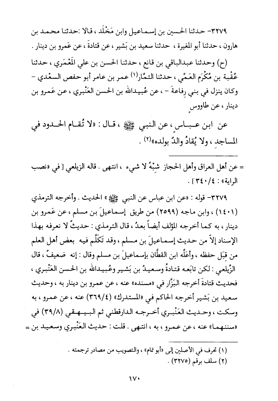 3279 - نا الْحُسَيْنُ بْنُ إِسْمَاعِيلَ , وَابْنُ مَخْلَدٍ , قَالَا: نا مُحَمَّدُ بْنُ هَارُونَ , نا أَبُو الْمُغِيرَةِ , نا سَعِيدُ بْنُ بَشِيرٍ , عَنْ قَتَادَةَ , عَنْ عَمْرِو بْنِ دِينَارٍ , ح وَنا عَبْدُ الْبَاقِي بْنُ قَانِعٍ , نا الْحَسَنُ بْنُ عَلِيٍّ الْمَعْمَرِيُّ , نا عُقْبَةُ بْنُ مُكْرَمٍ الْعَمِّيُّ , نا تُمَارٌ عُمَرُ بْنُ عَامِرٍ أَبُو حَفْصٍ السَّعْدِيُّ وَكَانَ يَنْزِلُ فِي بَنِي رِفَاعَةَ , عَنْ عُبَيْدِ اللَّهِ بْنِ الْحَسَنِ الْعَنْبَرِيِّ , عَنْ عَمْرِو بْنِ دِينَارٍ , عَنْ طَاوُسٍ , عَنِ ابْنِ عَبَّاسٍ , عَنِ النَّبِيِّ صَلَّى اللهُ عَلَيْهِ وَسَلَّمَ , قَالَ: § «لَا تُقَامُ الْحُدُودُ فِي الْمَسَاجِدِ , وَلَا يُقَادُ الْوَالِدُ بِوَلَدِهِ»