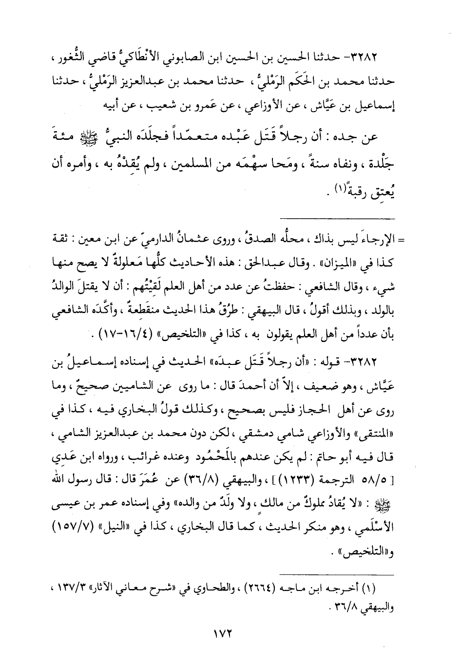 3282 - نا الْحُسَيْنُ بْنُ الْحُسَيْنِ بْنِ الصَّابُونِيِّ الْأَنْطَاكِيُّ قَاضِي الثُّغُورِ , نا مُحَمَّدُ بْنُ عَبْدِ الْحَكَمِ الرَّمْلِيُّ , حَدَّثَنَا مُحَمَّدُ بْنُ عَبْدِ الْعَزِيزِ الرَّمْلِيُّ , نا إِسْمَاعِيلُ بْنُ عَيَّاشٍ , عَنِ الْأَوْزَاعِيِّ , عَنْ عَمْرِو بْنِ شُعَيْبٍ , عَنْ أَبِيهِ , عَنْ جَدِّهِ , أَنَّ رَجُلًا قَتَلَ عَبْدَهُ مُتَعَمِّدًا , «فَجَلَدَهُ النَّبِيُّ صَلَّى اللهُ عَلَيْهِ وَسَلَّمَ مِائَةَ جَلْدَةٍ وَنَفَاهُ سَنَةً §وَمَحَى سَهْمَهُ مِنَ الْمُسْلِمِينَ , وَلَمْ يُقِدْهُ بِهِ , وَأَمَرَهُ أَنْ يُعْتِقَ رَقَبَةً»