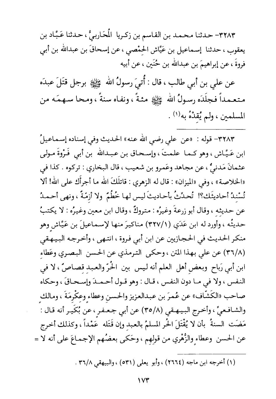 3283 - نا مُحَمَّدُ بْنُ الْقَاسِمِ بْنِ زَكَرِيَّا , نا عَبَّادُ بْنُ يَعْقُوبَ , نا إِسْمَاعِيلُ بْنُ عَيَّاشٍ الْحِمْصِيُّ , عَنْ إِسْحَاقَ بْنِ عَبْدِ اللَّهِ بْنِ أَبِي فَرْوَةَ , عَنْ إِبْرَاهِيمَ بْنِ عَبْدِ اللَّهِ بْنِ حُنَيْنٍ , عَنْ أَبِيهِ , عَنْ عَلِيِّ بْنِ أَبِي طَالِبٍ رَضِيَ اللَّهُ عَنْهُ , قَالَ: «أُتِيَ رَسُولُ اللَّهِ صَلَّى اللهُ عَلَيْهِ وَسَلَّمَ بِرَجُلٍ قَتَلَ عَبْدَهُ مُتَعَمِّدًا , فَجَلَدَهُ رَسُولُ اللَّهِ صَلَّى اللهُ عَلَيْهِ وَسَلَّمَ مِائَةَ جَلْدَةٍ وَنَفَاهُ سَنَةً §وَمَحَى سَهْمَهُ مِنَ الْمُسْلِمِينَ , وَلَمْ يُقِدْهُ بِهِ». -[174]-
