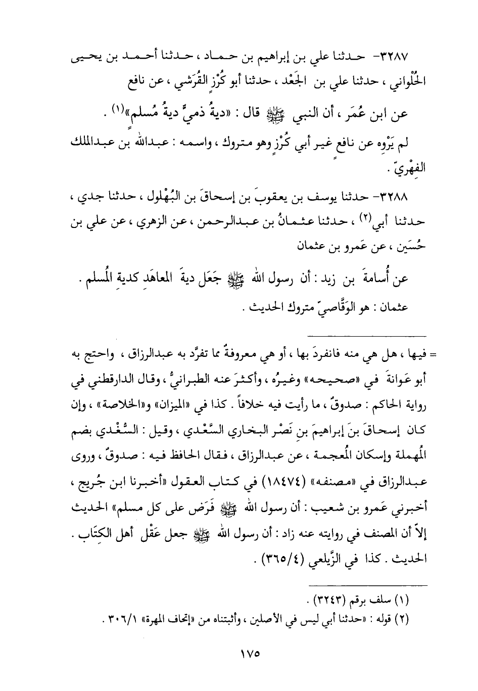 3288 - نا يُوسُفُ بْنُ يَعْقُوبَ بْنِ إِسْحَاقَ بْنِ بُهْلُولٍ , نا أَبِي، نا جَدِّي، حَدَّثَنَا عُثْمَانُ بْنُ عَبْدِ الرَّحْمَنِ , عَنِ الزُّهْرِيِّ , عَنْ عَلِيِّ بْنِ حُسَيْنٍ , عَنْ عَمْرِو بْنِ عُثْمَانَ , عَنْ أُسَامَةَ بْنِ زَيْدٍ , أَنَّ رَسُولَ اللَّهِ صَلَّى اللهُ عَلَيْهِ وَسَلَّمَ § «جَعَلَ دِيَةَ الْمُعَاهِدِ كَدِيَةِ الْمُسْلِمِ». عُثْمَانُ هُوَ الْوَقَّاصِيُّ مَتْرُوكُ الْحَدِيثِ