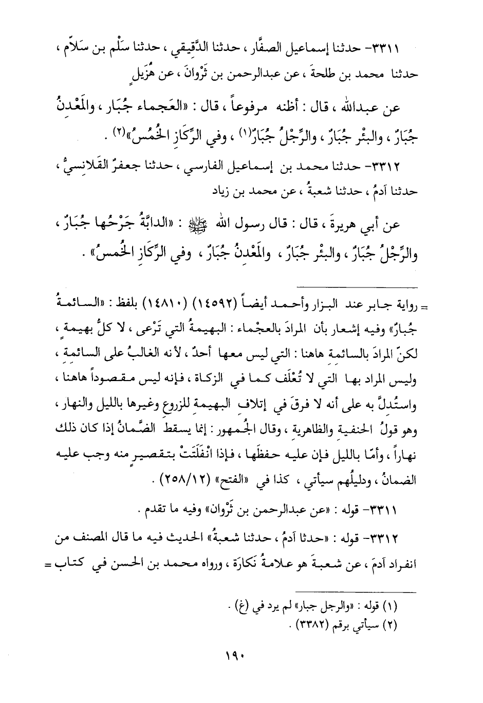 3312 - نا مُحَمَّدُ بْنُ إِسْمَاعِيلَ الْفَارِسِيُّ , نا جَعْفَرٌ الْقَلَانِسِيُّ , نا آدَمُ , نا شُعْبَةُ , عَنْ مُحَمَّدِ بْنِ زِيَادٍ , عَنْ أَبِي هُرَيْرَةَ , قَالَ: قَالَ رَسُولُ اللَّهِ صَلَّى اللهُ عَلَيْهِ وَسَلَّمَ: § «الدَّابَّةُ جُرْحُهَا جُبَارٌ , وَالرِّجْلُ جُبَارٌ وَالْبِئْرُ جُبَارٌ , وَالْمَعْدِنُ جُبَارٌ , وَفِي الرِّكَازِ الْخُمُسُ» -[191]- لَمْ يَرْوِهِ عَنْ شُعْبَةَ غَيْرُ آدَمَ , قَوْلُهُ: الرِّجْلُ جُبَارٌ
