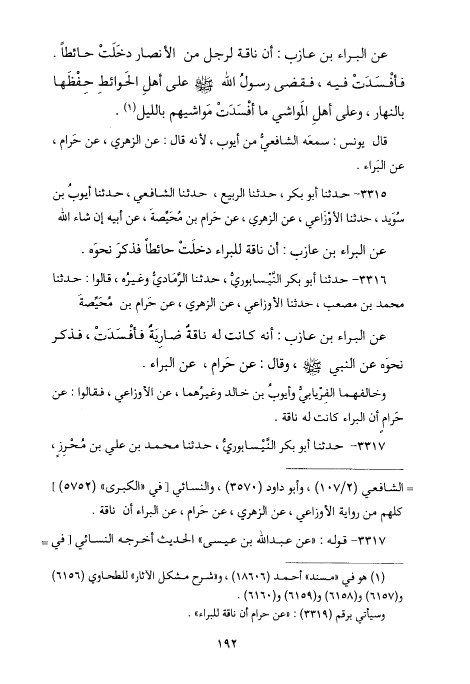 3317 - نا أَبُو بَكْرٍ النَّيْسَابُورِيُّ , نا مُحَمَّدُ بْنُ عَلِيِّ بْنِ مُحْرِزٍ , -[193]- نا مُعَاوِيَةُ بْنُ هِشَامٍ , نا سُفْيَانُ , عَنْ عَبْدِ اللَّهِ بْنِ عِيسَى , عَنِ الزُّهْرِيِّ , عَنْ حَرَامِ بْنِ مُحَيِّصَةَ , عَنِ الْبَرَاءِ , أَنَّ نَاقَةً لِآلِ الْبَرَاءِ أَفْسَدَتْ شَيْئًا فَقَضَى رَسُولُ اللَّهِ صَلَّى اللهُ عَلَيْهِ وَسَلَّمَ أَنَّ § «حِفْظَ الثِّمَارِ عَلَى أَهْلِهَا بِالنَّهَارِ , وَضَمَّنَ أَهْلَ الْمَاشِيَةِ مَا أَفْسَدَتْ مَاشِيَتُهُمْ بِاللَّيْلِ».