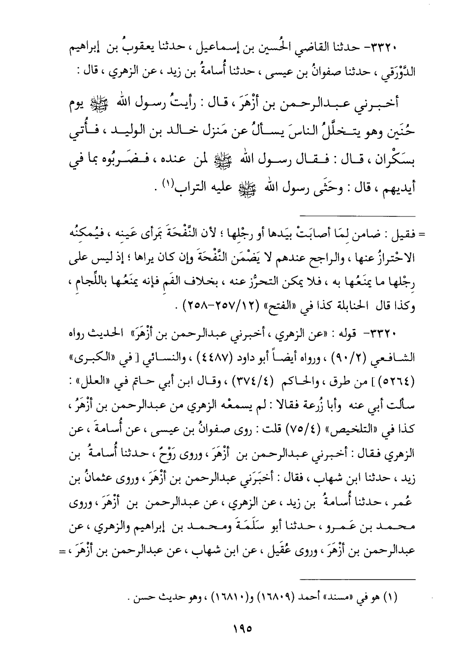3320 - نا الْقَاضِي الْحُسَيْنُ بْنُ إِسْمَاعِيلَ , نا يَعْقُوبُ بْنُ إِبْرَاهِيمَ الدَّوْرَقِيُّ , نا صَفْوَانُ بْنُ عِيسَى , نا أُسَامَةُ بْنُ زَيْدٍ , عَنِ الزُّهْرِيِّ , أَخْبَرَنِي عَبْدُ الرَّحْمَنِ بْنُ أَزْهَرَ , قَالَ: رَأَيْتُ رَسُولَ اللَّهِ صَلَّى اللهُ عَلَيْهِ وَسَلَّمَ يَوْمَ حُنَيْنٍ وَهُوَ يَتَخَلَّلُ النَّاسَ يَسْأَلُ عَنْ مَنْزِلِ خَالِدِ بْنِ الْوَلِيدِ , فَأُتِيَ بِسَكْرَانٍ , قَالَ: فَقَالَ رَسُولُ اللَّهِ صَلَّى اللهُ عَلَيْهِ وَسَلَّمَ لِمَنْ عِنْدَهُ , §فَضَرَبُوهُ بِمَا فِي أَيْدِيهِمْ , قَالَ: «وَحَثَى رَسُولُ اللَّهِ صَلَّى اللهُ عَلَيْهِ وَسَلَّمَ التُّرَابَ». -[196]- قَالَ: ثُمَّ أُتِيَ أَبُو بَكْرٍ بِسَكْرَانٍ , قَالَ: فَتَوَخَّى الَّذِي كَانَ مَنْ ضَرَبَهُمْ يَوْمَئِذٍ فَضَرَبَ أَرْبَعِينَ