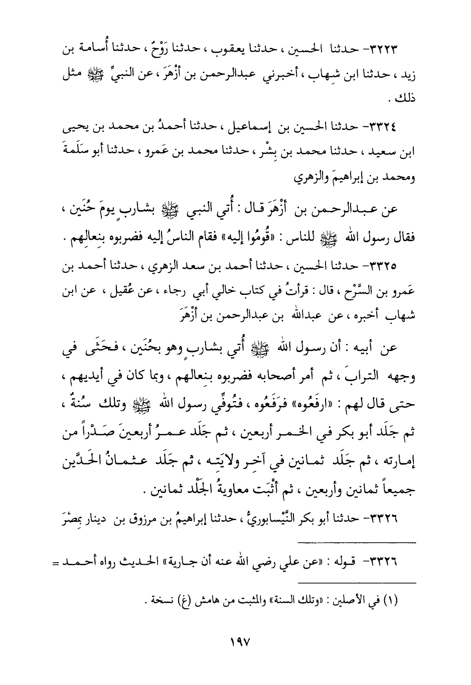 3324 - حَدَّثَنَا الْحُسَيْنُ بْنُ إِسْمَاعِيلَ , نا أَحْمَدُ بْنُ مُحَمَّدِ بْنِ يَحْيَى بْنِ سَعِيدٍ , نا مُحَمَّدُ بْنُ بِشْرٍ , نا مُحَمَّدُ بْنُ عَمْرٍو , نا أَبُو سَلَمَةَ , وَمُحَمَّدُ بْنُ إِبْرَاهِيمَ , وَالزُّهْرِيُّ , عَنْ عَبْدِ الرَّحْمَنِ بْنِ أَزْهَرَ , قَالَ: أُتِيَ النَّبِيُّ صَلَّى اللهُ عَلَيْهِ وَسَلَّمَ بِشَارِبٍ يَوْمَ حُنَيْنٍ , فَقَالَ رَسُولُ اللَّهِ صَلَّى اللهُ عَلَيْهِ وَسَلَّمَ لِلنَّاسِ: § «قُومُوا إِلَيْهِ» , فَقَامَ النَّاسُ إِلَيْهِ فَضَرَبُوهُ بِنِعَالِهِمْ